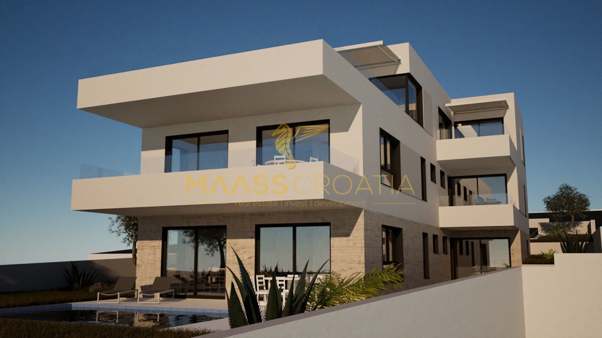 Moderna dvospratna kuća s krovnom terasom, bazenom i prekrasnim pogledom na more