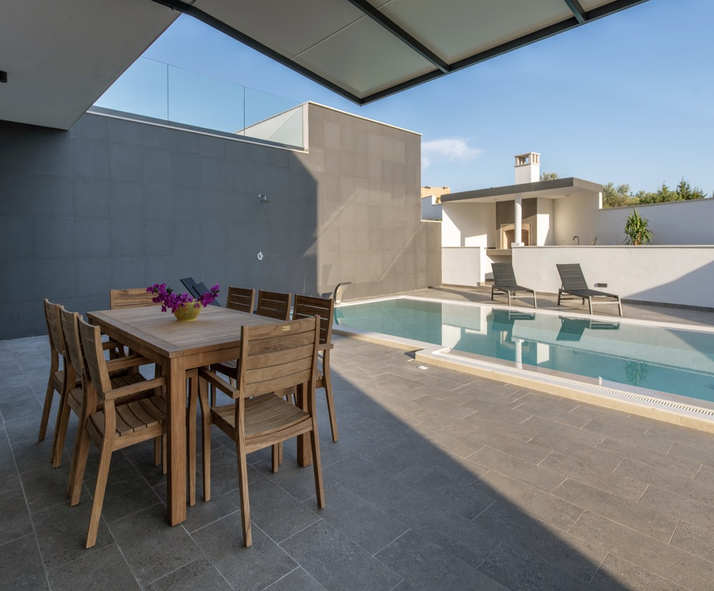 Utenfor huset er det en terrasse med sittegruppe som er koblet til et stort svømmebasseng med utsikt over bukten.