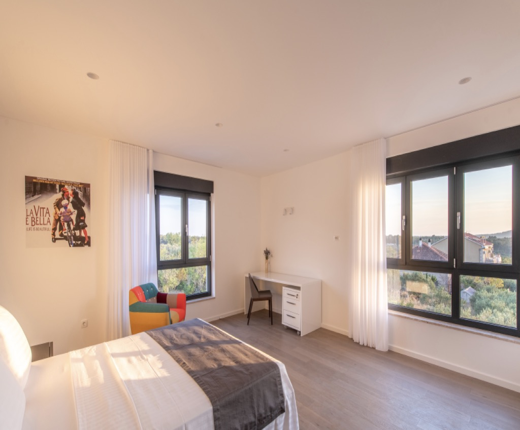Høye tak og brede vinduer oversvømmer plassen med lys, noe som forsterker atmosfæren i hele eiendommen.