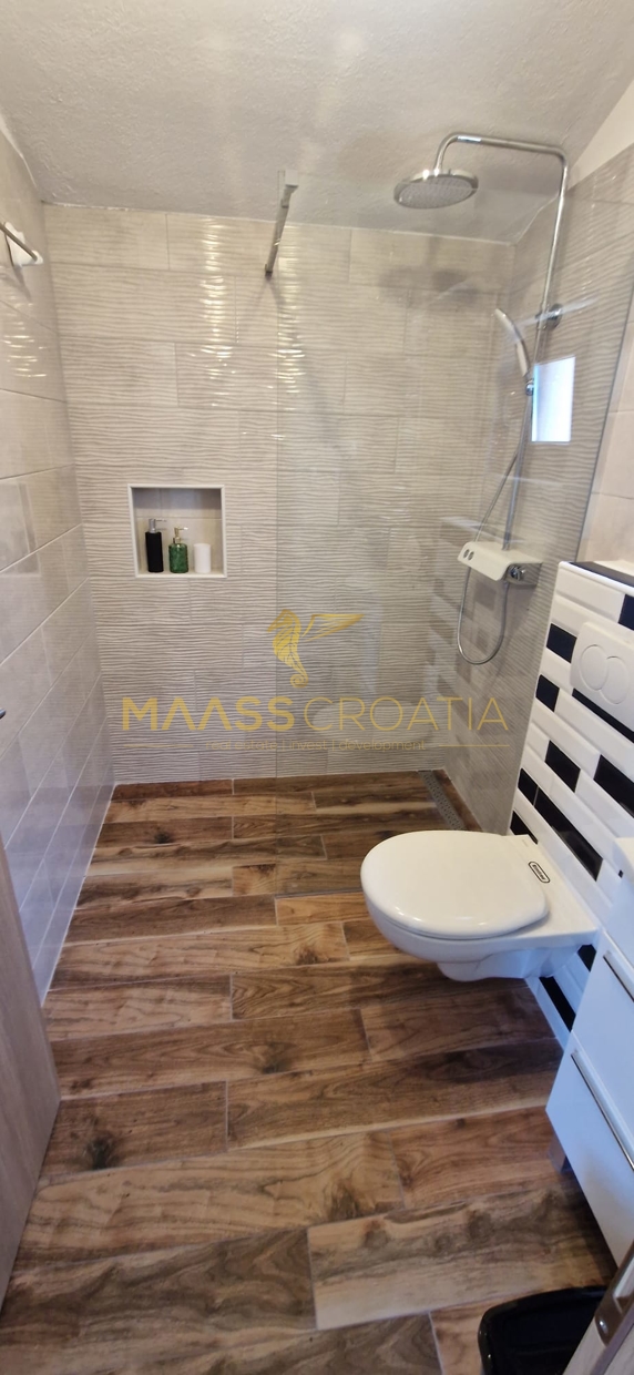 U visokom prizemlju nalazi se prekrasan, namješten stan koji se sastoji od kuhinje, blagovaonice, dnevnog boravka, dvije spavaće sobe, kupaonice i balkona.
