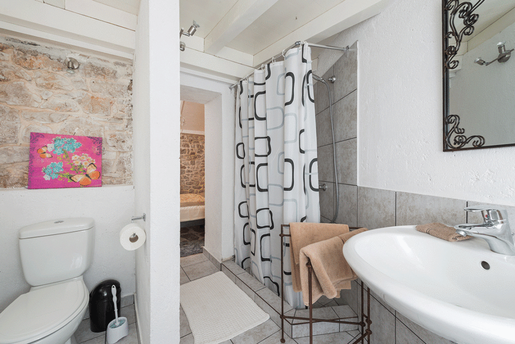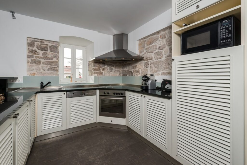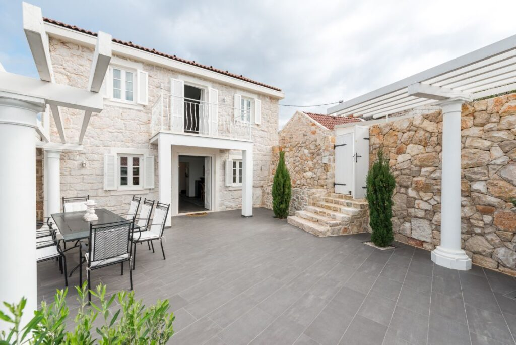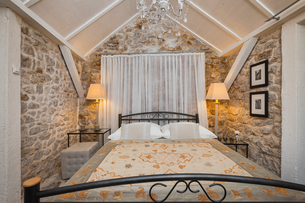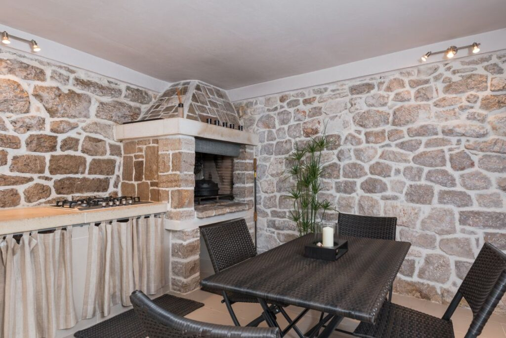 Nekretnina je podijeljena na tri jedinice/tri kamene kuće. Središnja glavna kuća nalazi se u srcu nekretnine i prostire se na dva kata. Sadrži četiri spavaće sobe i četiri kupaonice. U prizemlju se nalazi potpuno opremljena, moderna kuhinja, elegantno namještena blagovaonica, stilski uređen dnevni boravak i moderna kupaonica.