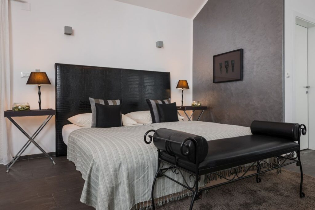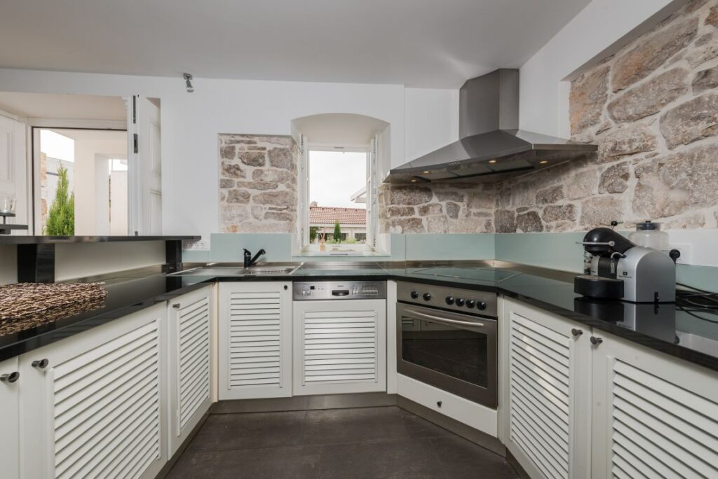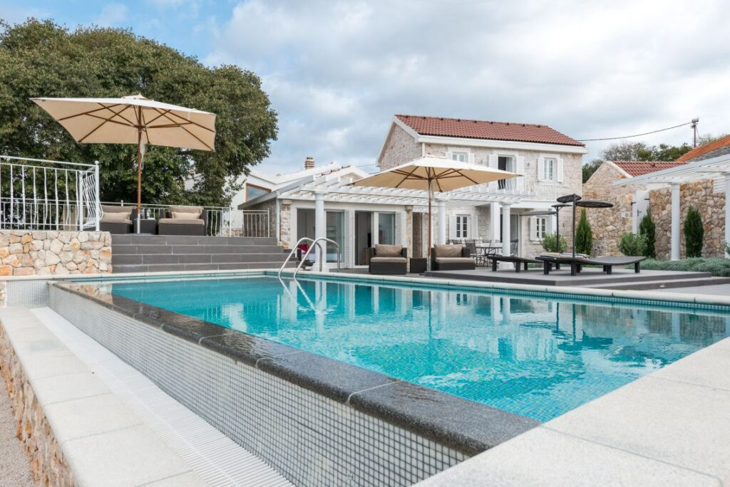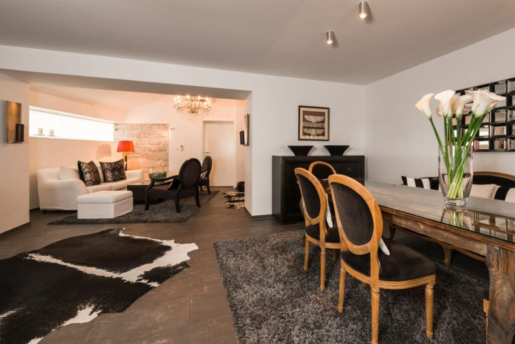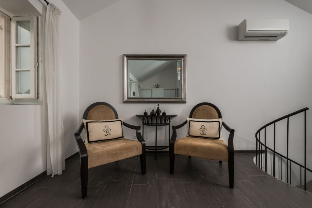 Nekretnina je podijeljena na tri jedinice/tri kamene kuće. Središnja glavna kuća nalazi se u srcu nekretnine i prostire se na dva kata. Sadrži četiri spavaće sobe i četiri kupaonice. U prizemlju se nalazi potpuno opremljena, moderna kuhinja, elegantno namještena blagovaonica, stilski uređen dnevni boravak i moderna kupaonica.