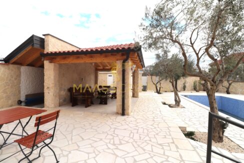 Ova prekrasna nekretnina uključuje grijani bazen veličine 10 x 4 metra, sunčalište, paviljon iza kojeg se nalazi vinski podrum, vanjski kamin, strojarnicu i spremište.