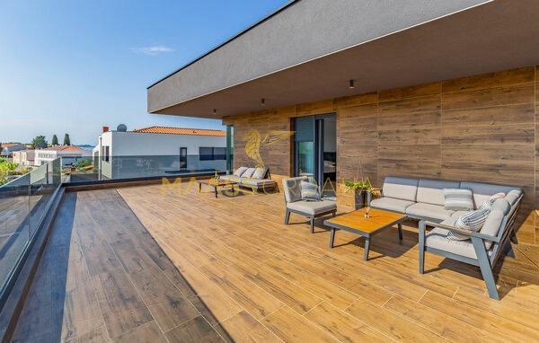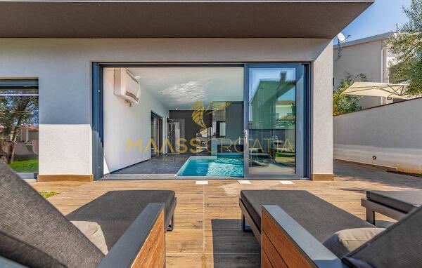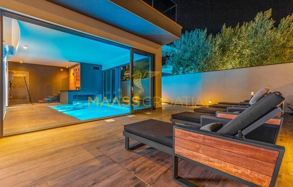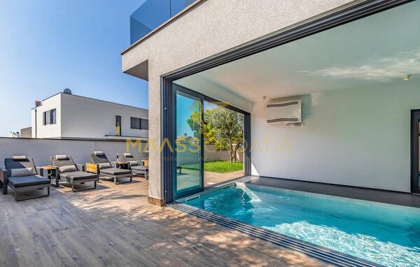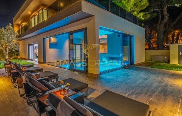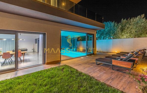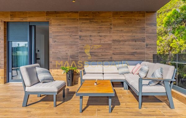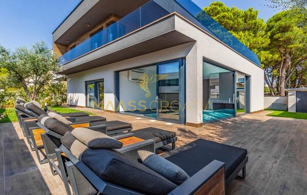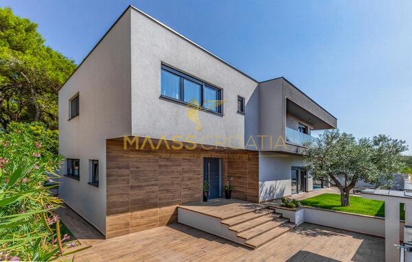 Prodaje se moderna vila s bazenom, 200 m od plaže. Vila ima 285 m² stambenog prostora i nalazi se na okućnici od 480 m², okružena borovima.