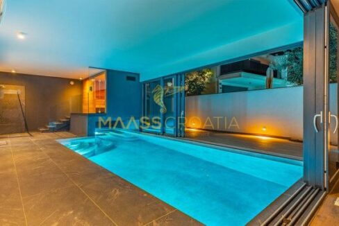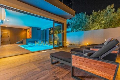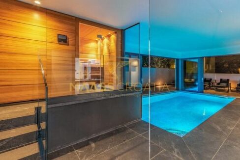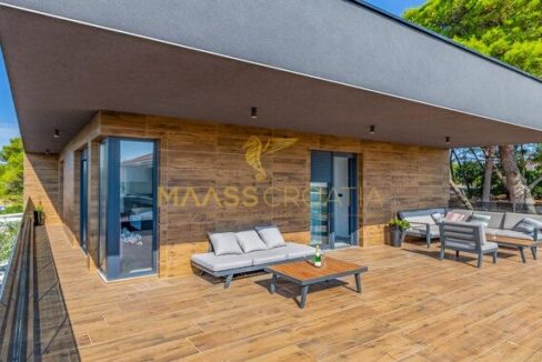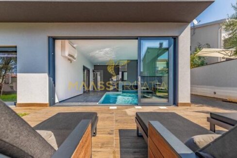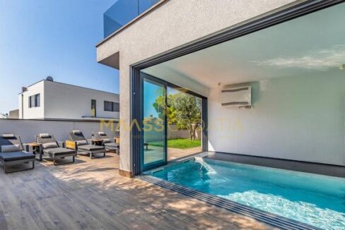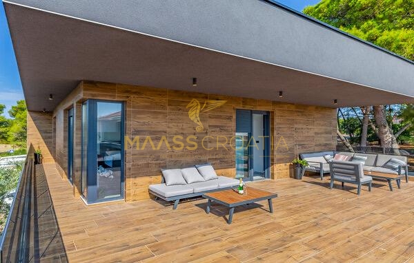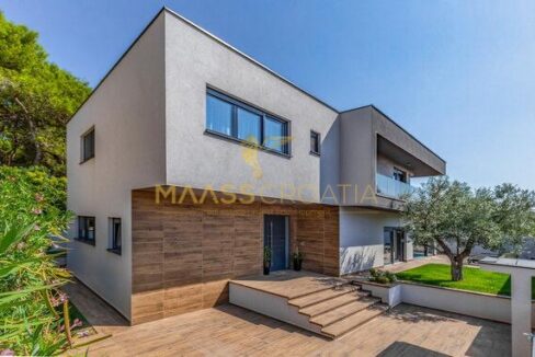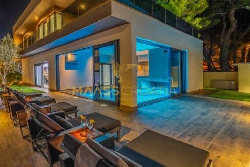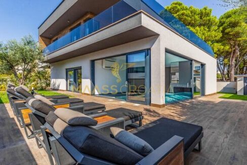 Prodaje se moderna vila s bazenom, 200 m od plaže. Vila ima 285 m² stambenog prostora i nalazi se na okućnici od 480 m², okružena borovima.
