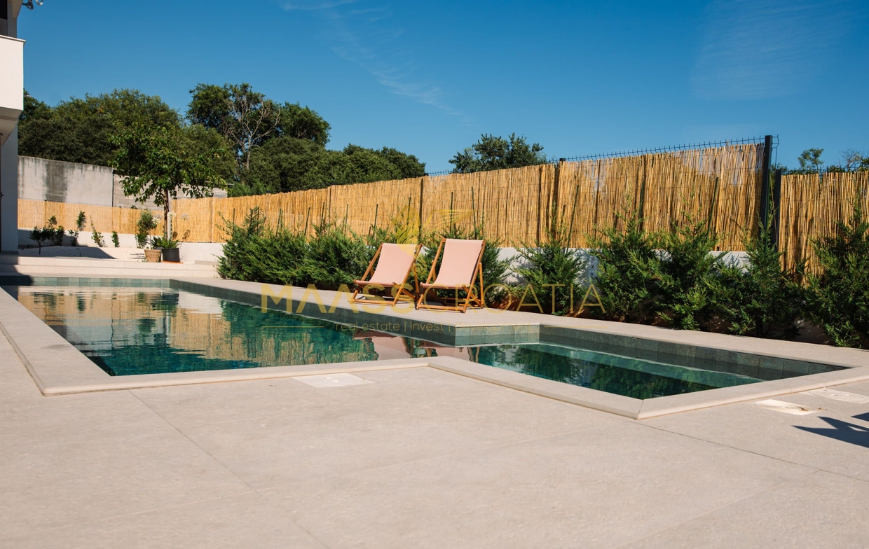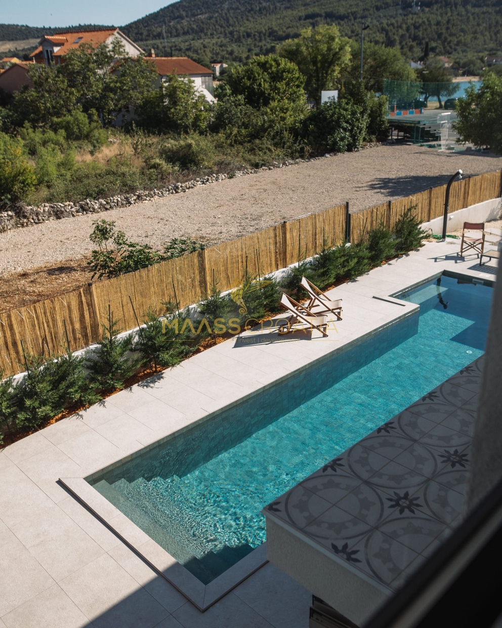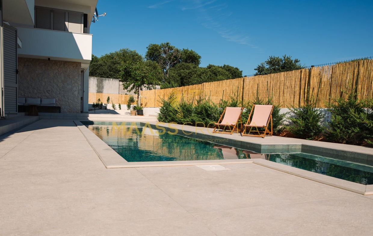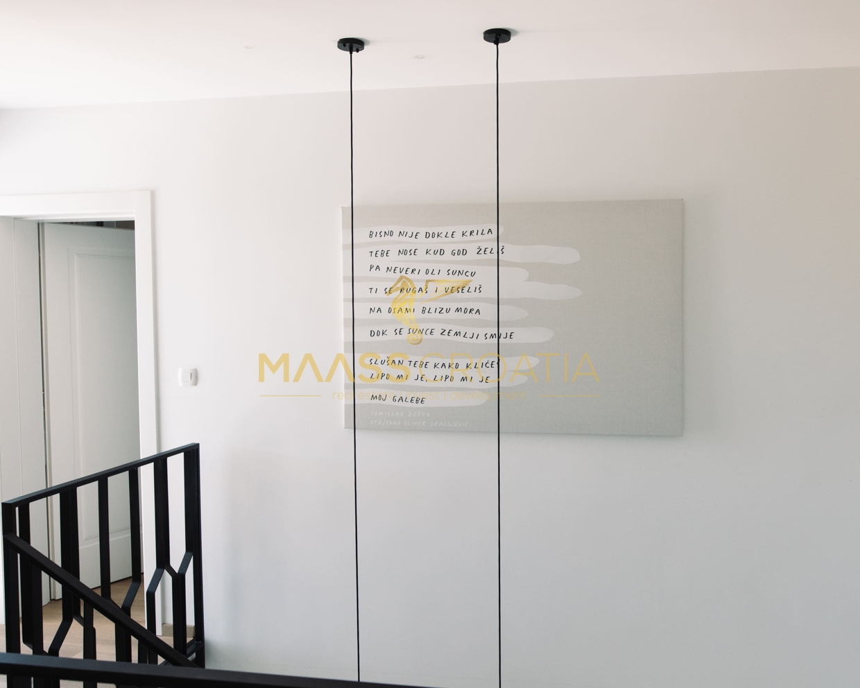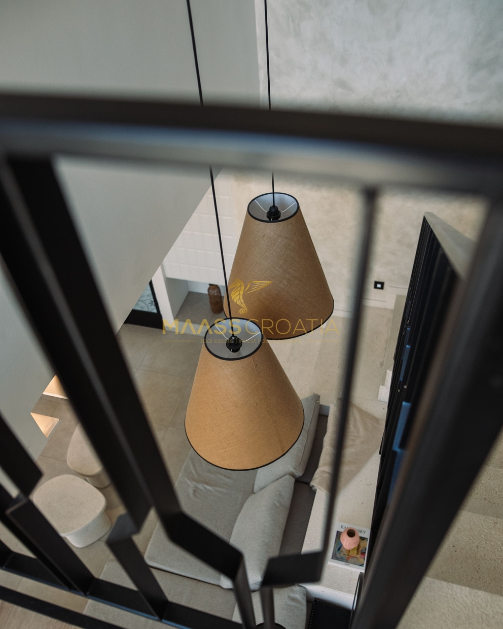 Na mirnoj i izuzetno atraktivnoj lokaciji, na obali Prokljanskog jezera u Bilicama kraj Šibenika, smještena je moderna luksuzna vila površine 200 m², izgrađena 2024. godine, na prostranoj parceli od 1.000 m², udaljenoj svega 50 m od plaže. Ova elegantna nekretnina nudi savršen spoj vrhunske gradnje, suvremene udobnosti i izvanredne pozicije koja jamči potpunu privatnost i mir. U prizemlju se nalazi prostrana dnevna zona s kuhinjom, blagovaonicom i dnevnim boravkom, jedna spavaća soba s direktnim izlazom na bazen i sunčalište, kupaonica te spremište. Na katu se nalaze tri dodatne spavaće sobe, dvije kupaonice, terasa i dva balkona s pogledom na prirodu i more. Cijeli interijer je moderno uređen i potpuno opremljen, što ovu nekretninu čini spremnom za useljenje bez ikakvih dodatnih ulaganja. U vanjskom dijelu parcele smješten je privatni bazen okružen uređenim sunčalištem, natkrivena vanjska kuhinja s roštiljem te više parkirnih mjesta. Okućnica je pažljivo uređena i osmišljena za maksimalno uživanje u privatnosti, miru i luksuzu, a cjelokupna nekretnina odiše kvalitetom i elegancijom. Vrhunska lokacija uz more, moderna novogradnja i prostrano zemljište čine ovu vilu izuzetnom prilikom za one koji traže trajnu vrijednost – bilo za vlastito korištenje ili kao sigurnu imovinu na jadranskoj obali. Blizina Nacionalnog parka Krka, povijesnog Šibenika i kristalno čistog mora čine ovu nekretninu savršenom prilikom za one koji traže mir, eleganciju i sigurnu vrijednost.