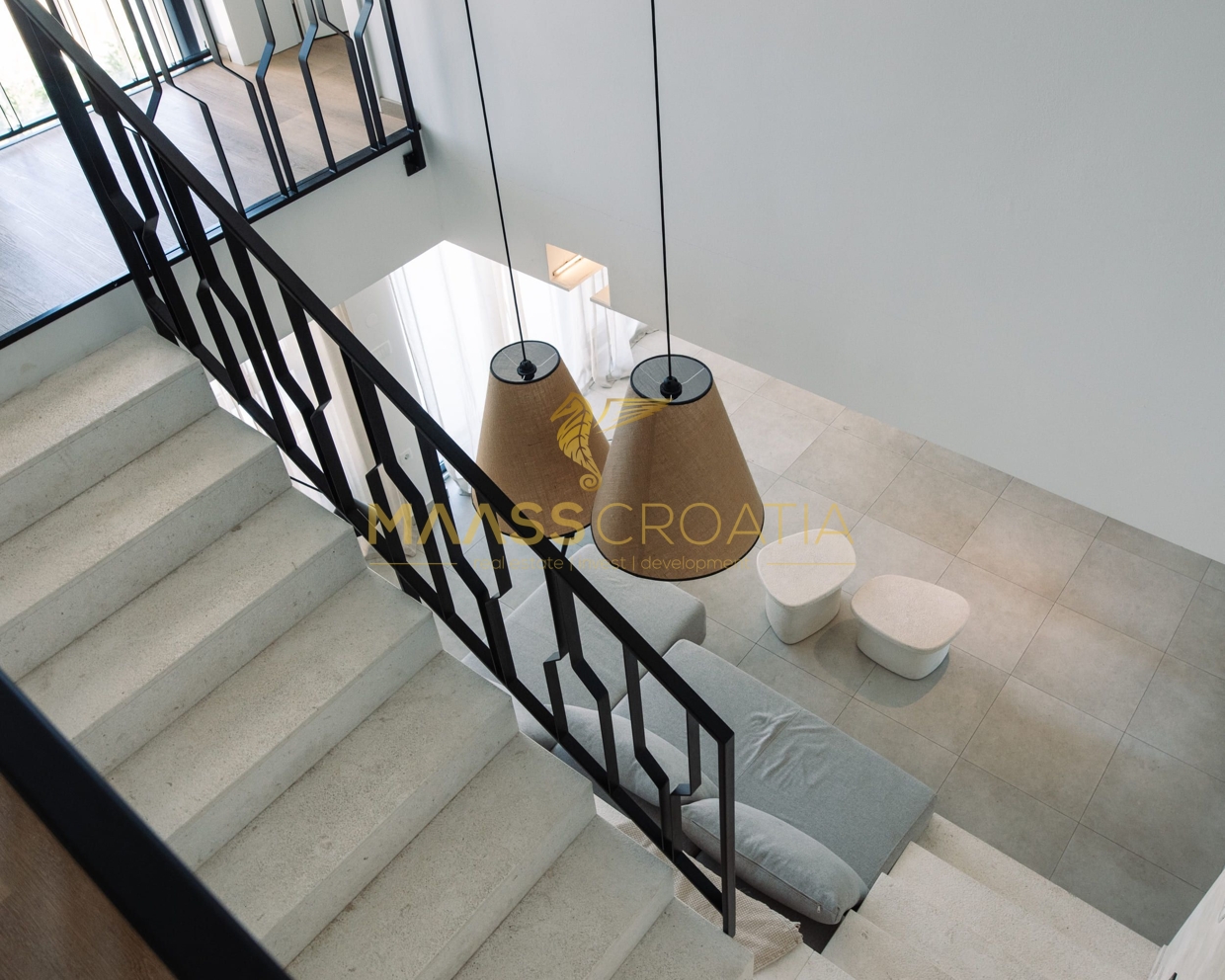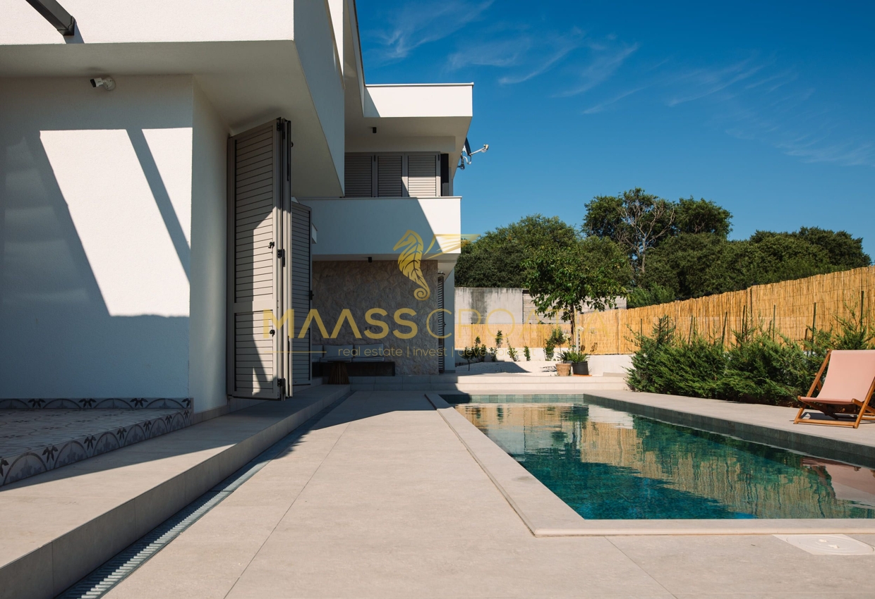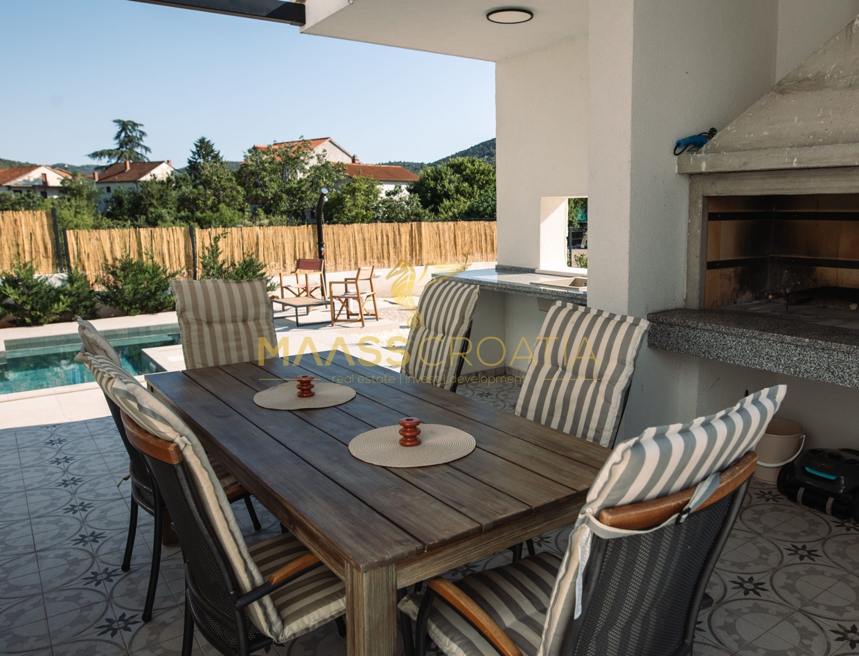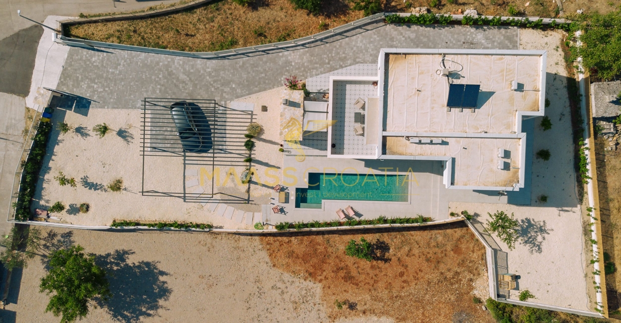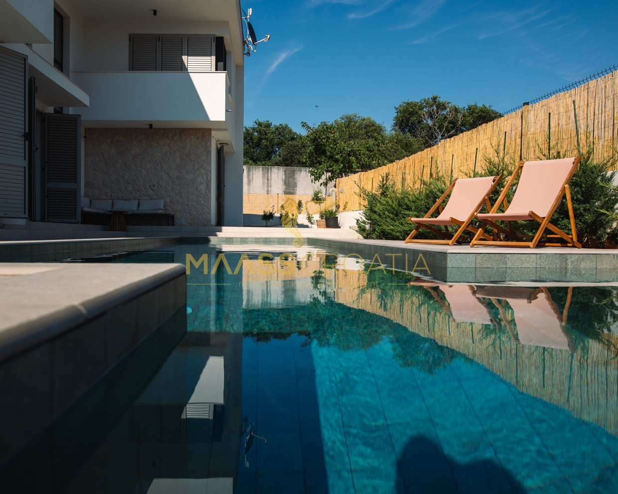 Na mirnoj i izuzetno atraktivnoj lokaciji, na obali Prokljanskog jezera u Bilicama kraj Šibenika, smještena je moderna luksuzna vila površine 200 m², izgrađena 2024. godine, na prostranoj parceli od 1.000 m², udaljenoj svega 50 m od plaže. Ova elegantna nekretnina nudi savršen spoj vrhunske gradnje, suvremene udobnosti i izvanredne pozicije koja jamči potpunu privatnost i mir. U prizemlju se nalazi prostrana dnevna zona s kuhinjom, blagovaonicom i dnevnim boravkom, jedna spavaća soba s direktnim izlazom na bazen i sunčalište, kupaonica te spremište. Na katu se nalaze tri dodatne spavaće sobe, dvije kupaonice, terasa i dva balkona s pogledom na prirodu i more. Cijeli interijer je moderno uređen i potpuno opremljen, što ovu nekretninu čini spremnom za useljenje bez ikakvih dodatnih ulaganja. U vanjskom dijelu parcele smješten je privatni bazen okružen uređenim sunčalištem, natkrivena vanjska kuhinja s roštiljem te više parkirnih mjesta. Okućnica je pažljivo uređena i osmišljena za maksimalno uživanje u privatnosti, miru i luksuzu, a cjelokupna nekretnina odiše kvalitetom i elegancijom. Vrhunska lokacija uz more, moderna novogradnja i prostrano zemljište čine ovu vilu izuzetnom prilikom za one koji traže trajnu vrijednost – bilo za vlastito korištenje ili kao sigurnu imovinu na jadranskoj obali. Blizina Nacionalnog parka Krka, povijesnog Šibenika i kristalno čistog mora čine ovu nekretninu savršenom prilikom za one koji traže mir, eleganciju i sigurnu vrijednost.