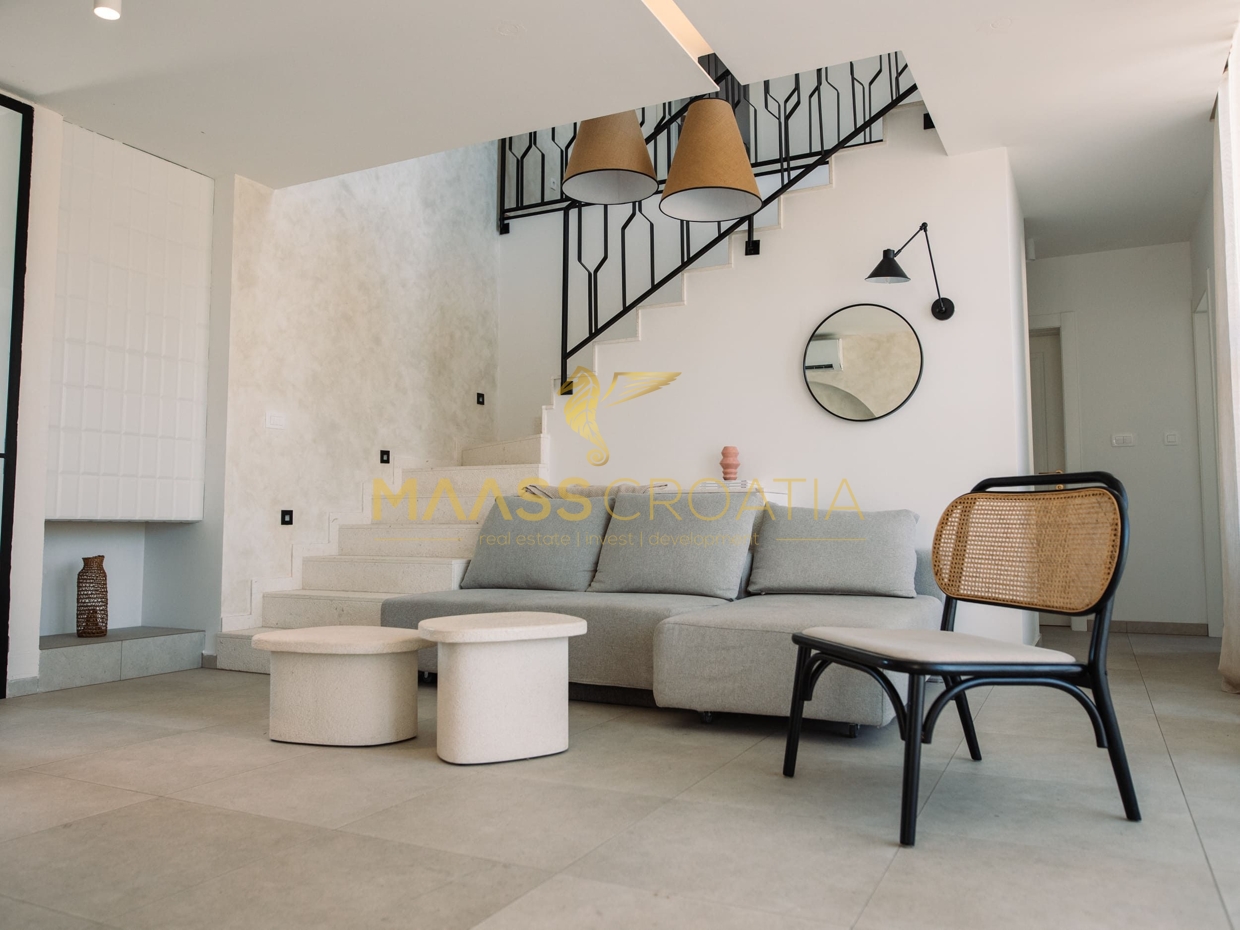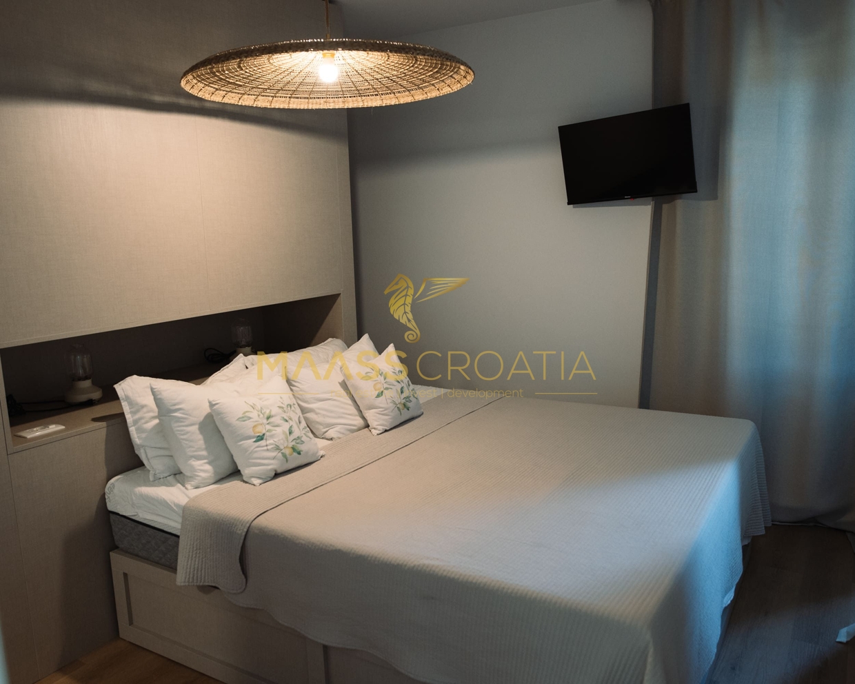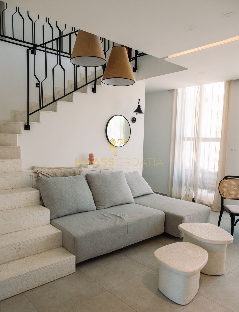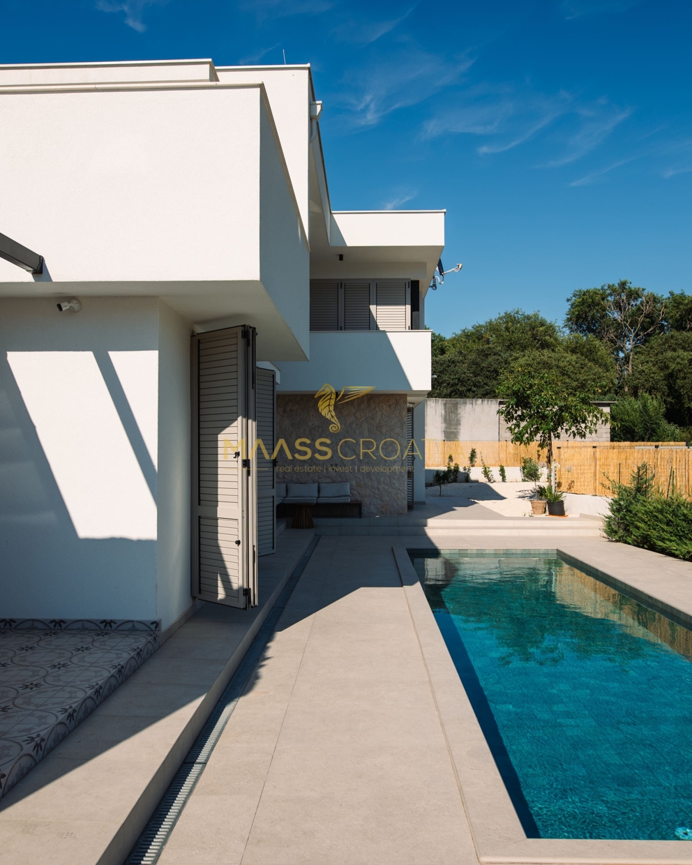 Na mirnoj i izuzetno atraktivnoj lokaciji, na obali Prokljanskog jezera u Bilicama kraj Šibenika, smještena je moderna luksuzna vila površine 200 m², izgrađena 2024. godine, na prostranoj parceli od 1.000 m², udaljenoj svega 50 m od plaže. Ova elegantna nekretnina nudi savršen spoj vrhunske gradnje, suvremene udobnosti i izvanredne pozicije koja jamči potpunu privatnost i mir. U prizemlju se nalazi prostrana dnevna zona s kuhinjom, blagovaonicom i dnevnim boravkom, jedna spavaća soba s direktnim izlazom na bazen i sunčalište, kupaonica te spremište. Na katu se nalaze tri dodatne spavaće sobe, dvije kupaonice, terasa i dva balkona s pogledom na prirodu i more. Cijeli interijer je moderno uređen i potpuno opremljen, što ovu nekretninu čini spremnom za useljenje bez ikakvih dodatnih ulaganja. U vanjskom dijelu parcele smješten je privatni bazen okružen uređenim sunčalištem, natkrivena vanjska kuhinja s roštiljem te više parkirnih mjesta. Okućnica je pažljivo uređena i osmišljena za maksimalno uživanje u privatnosti, miru i luksuzu, a cjelokupna nekretnina odiše kvalitetom i elegancijom. Vrhunska lokacija uz more, moderna novogradnja i prostrano zemljište čine ovu vilu izuzetnom prilikom za one koji traže trajnu vrijednost – bilo za vlastito korištenje ili kao sigurnu imovinu na jadranskoj obali. Blizina Nacionalnog parka Krka, povijesnog Šibenika i kristalno čistog mora čine ovu nekretninu savršenom prilikom za one koji traže mir, eleganciju i sigurnu vrijednost.