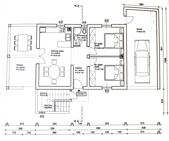 Das Auto kann in der Garage untergebracht werden, ein zweites Auto davor. Wer möchte kann die Garage jedoch auch zu weiterem Wohnraum ausbauen. Strom und SAT-TV sind angeschlossen, Wasser kommt aus einem Brunnen. Das Abwasser wird in der Septikgrube gesammelt.