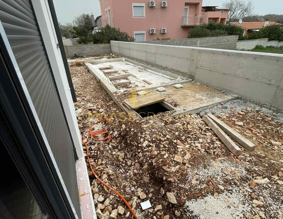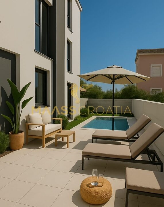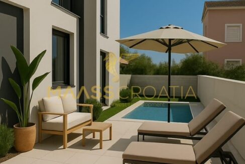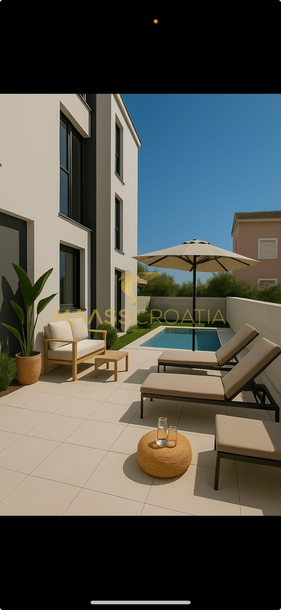 Iz svake prostorije pruža se izlaz na prostrano privatno dvorište koje predstavlja pravo malo utočište mira. U njegovom središtu nalazi se prekrasan bazen, idealan za opuštanje i uživanje u toplim ljetnim danima. Ovdje možete uživati u potpunoj privatnosti, okruženi zelenilom i mediteranskim ugođajem.
