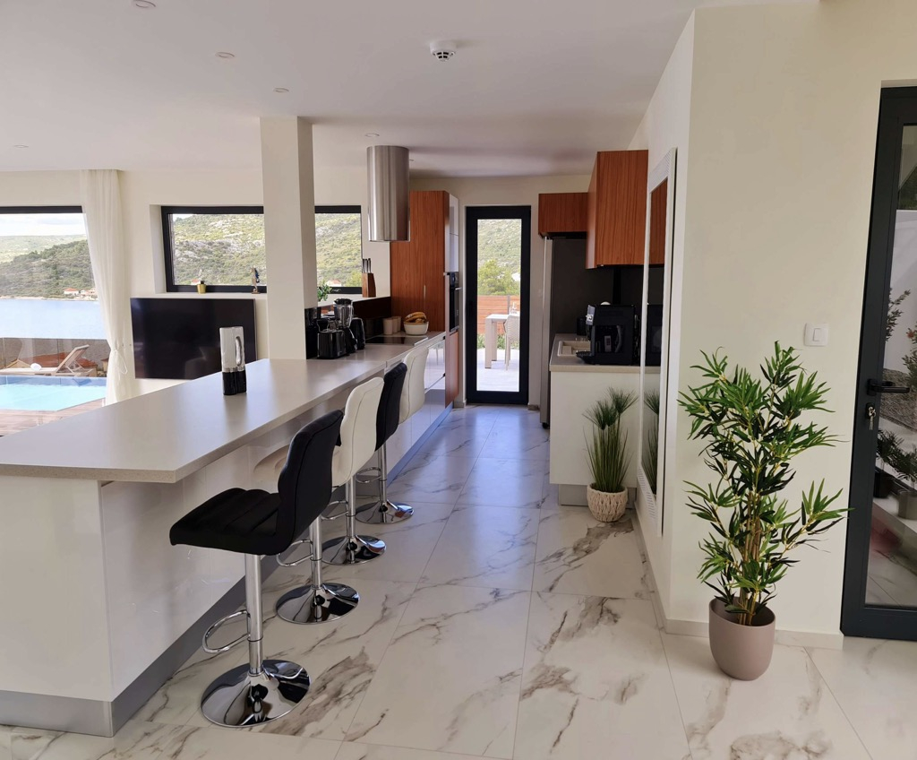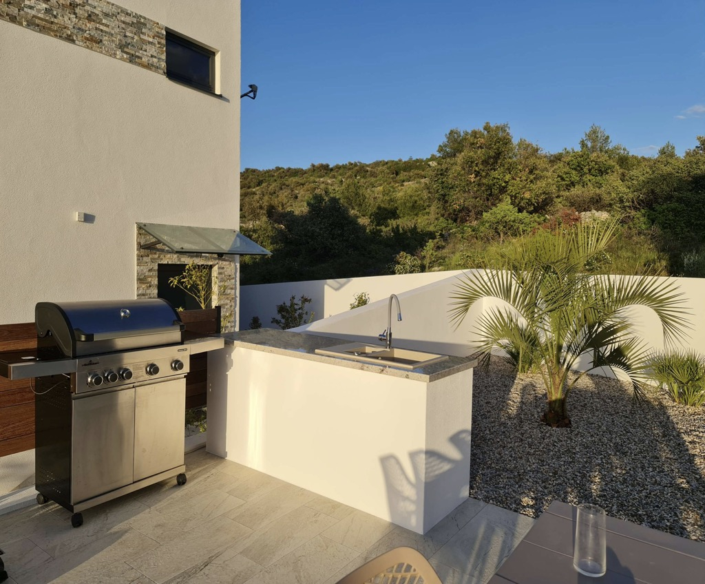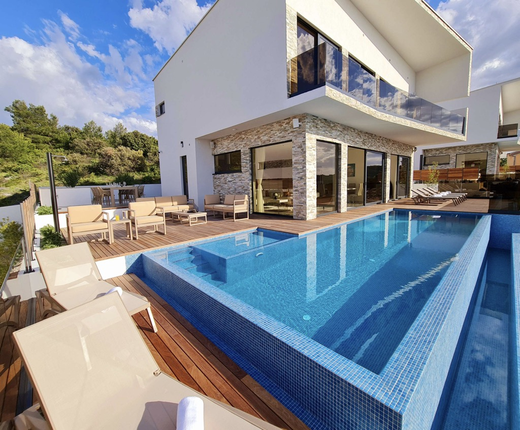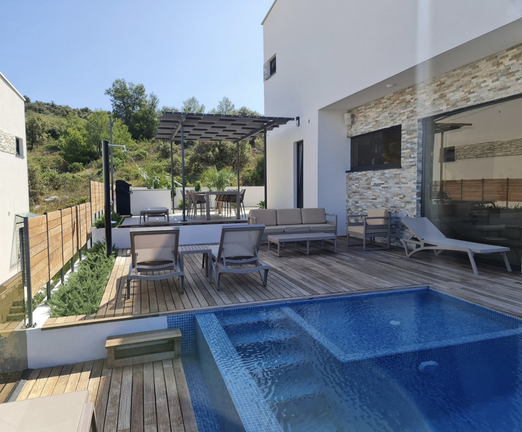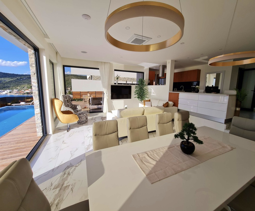 Prekrasna nova obiteljska kuća moderne arhitekture i funkcionalnog rasporeda samo 200 m od Plave plaže. Troetažni...