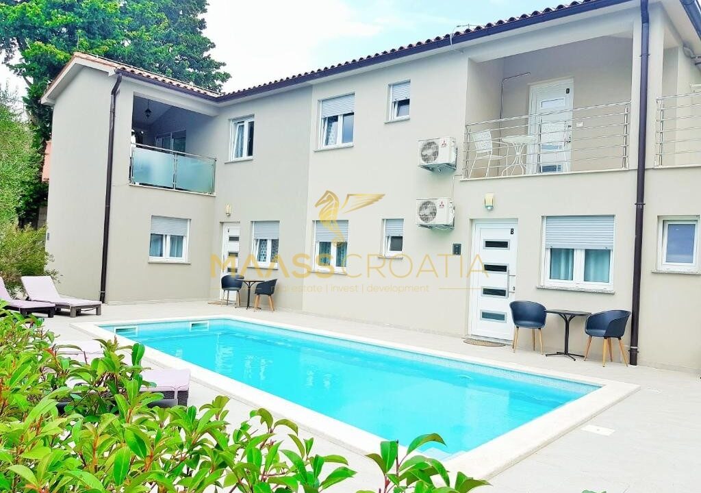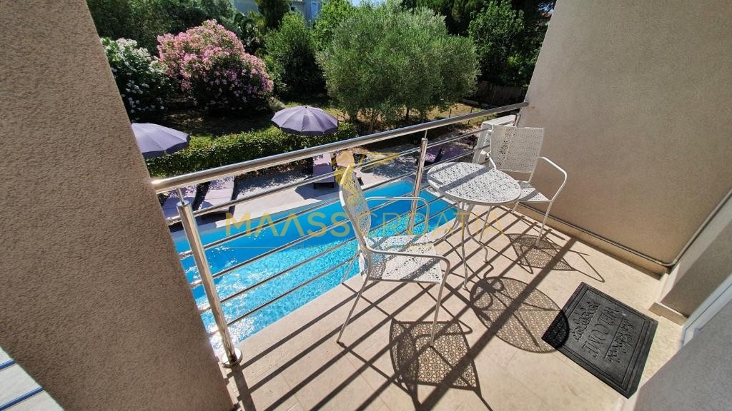 Apartmani u prizemlju imaju izravan izlaz na bazen, sunčalište i uređeni vrt, dok gornji apartmani raspolažu prostranim terasama.