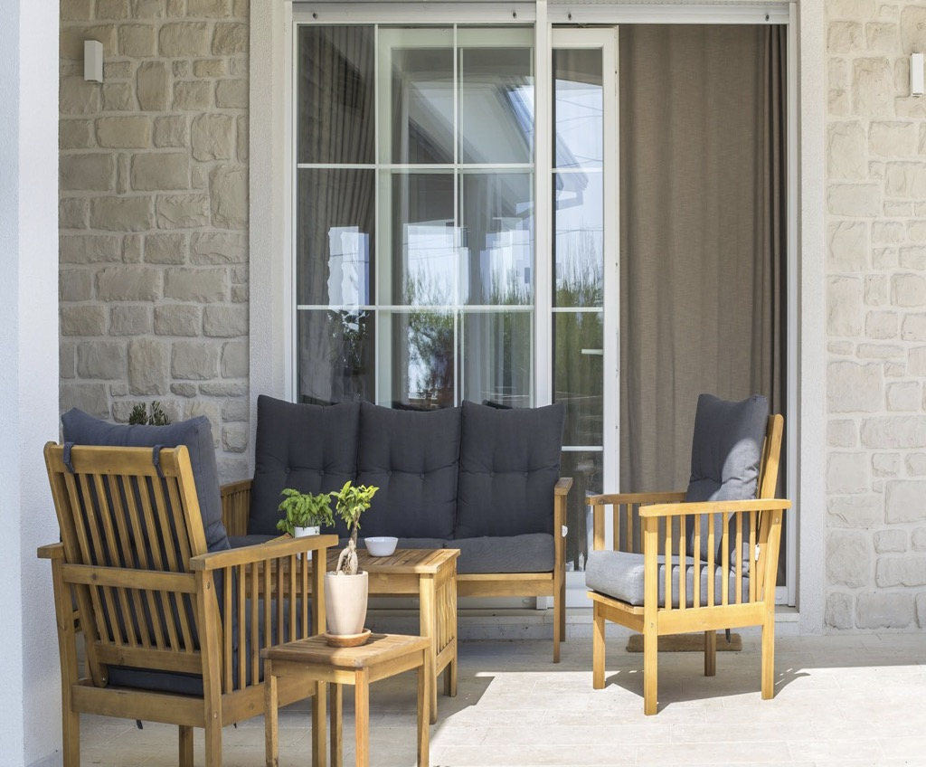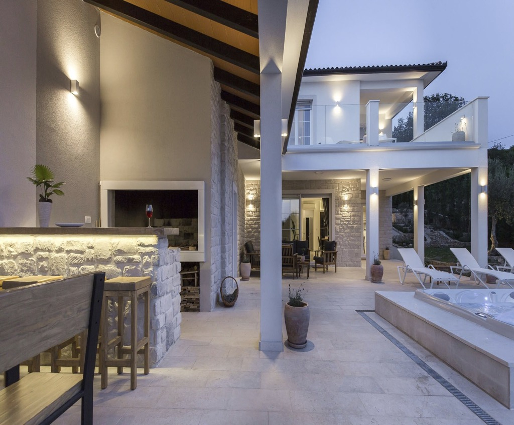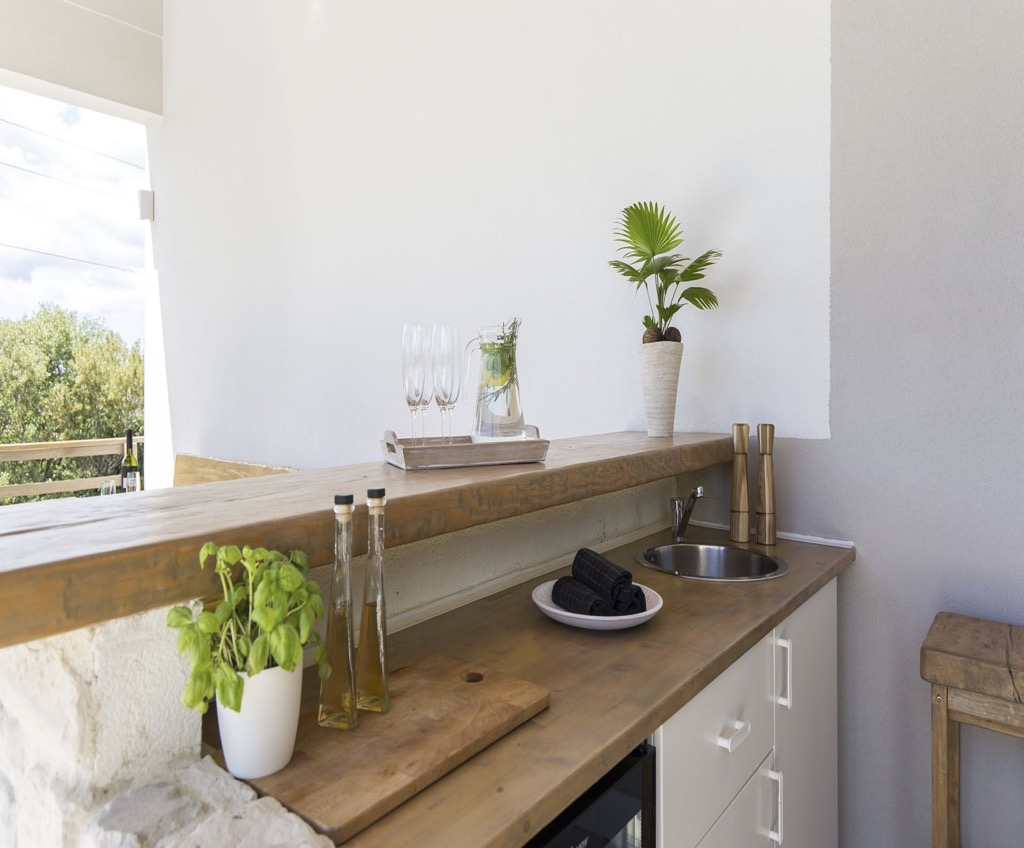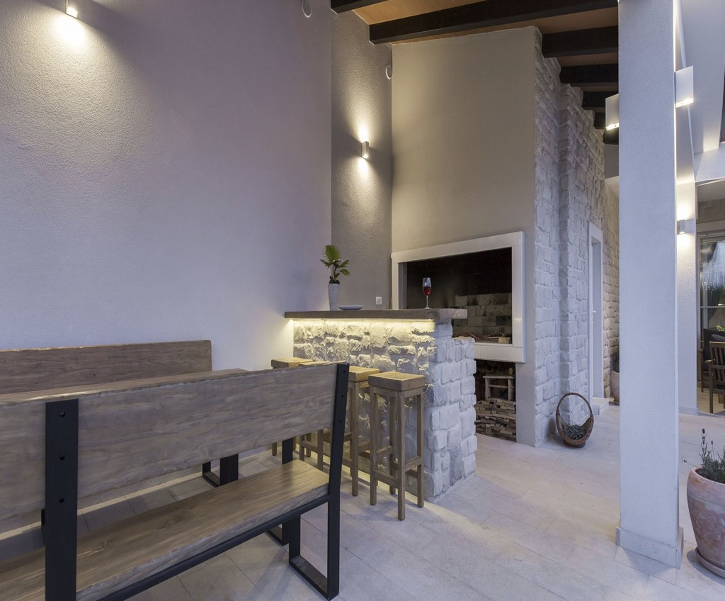 Počevši od prizemlja, imamo prostranu terasu sa susjednom vanjskom kuhinjom, s vlastitim šankom i sjedećom garniturom.