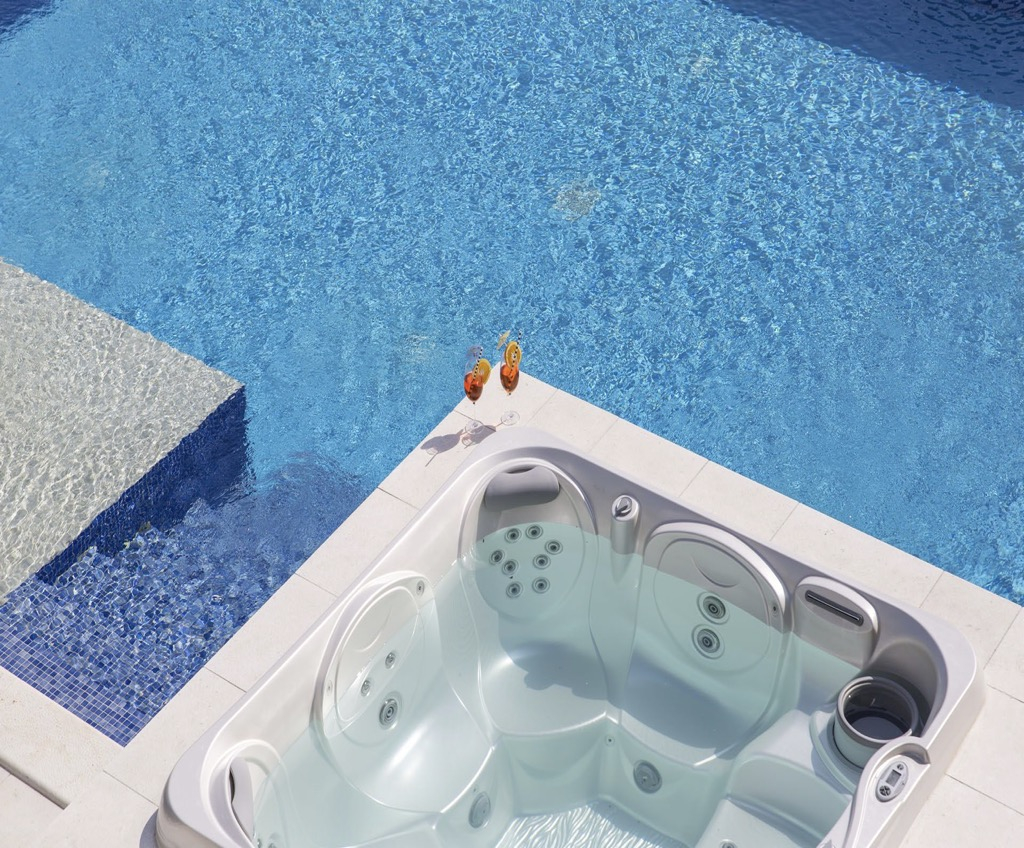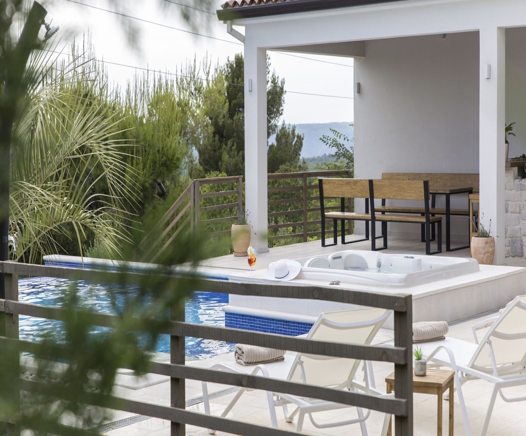 Tu je bazen s ugrađenim jacuzzijem, izravno povezan s terasom i prostorom za odmor.