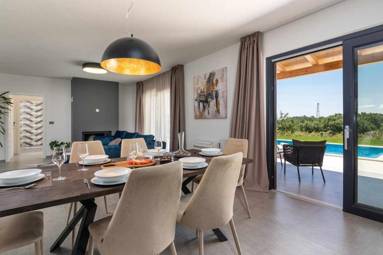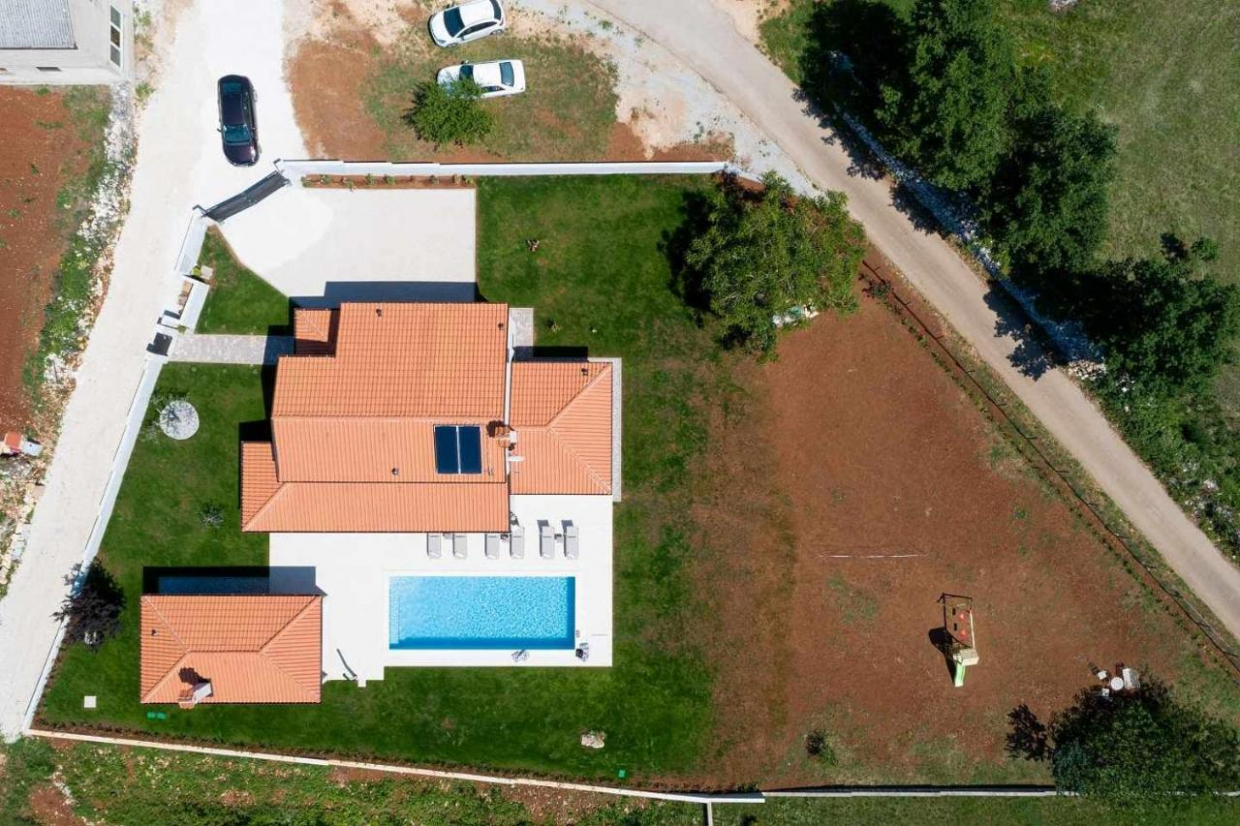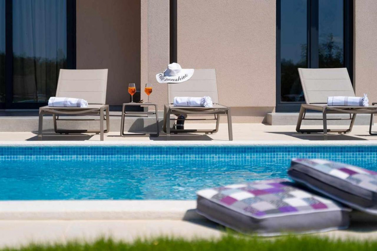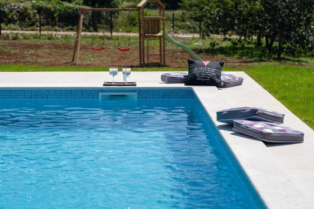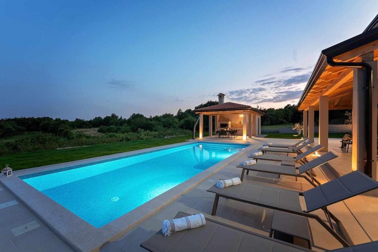 Kuća se može pohvaliti prostranim vanjskim prostorom s velikim bazenom, izravno povezanim s vanjskom ljetnom kuhinjom i ugodnim prostorom za sjedenje.