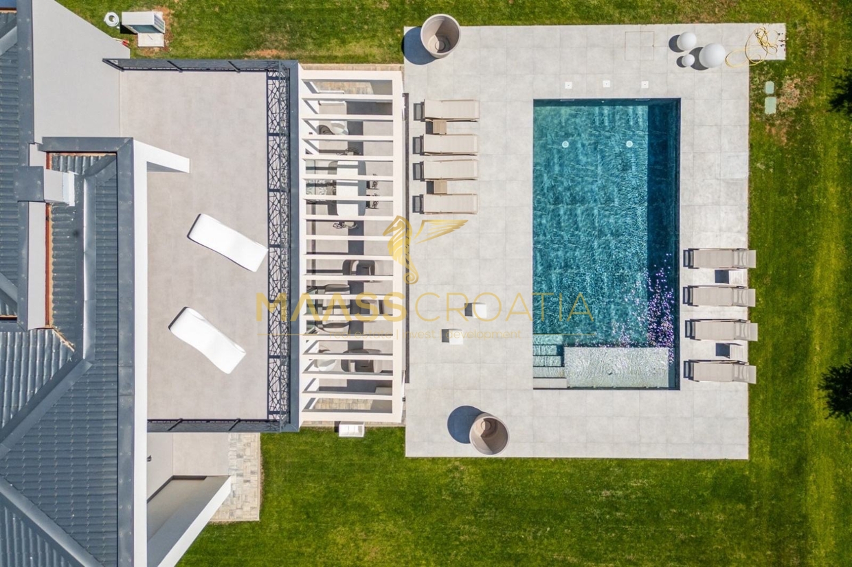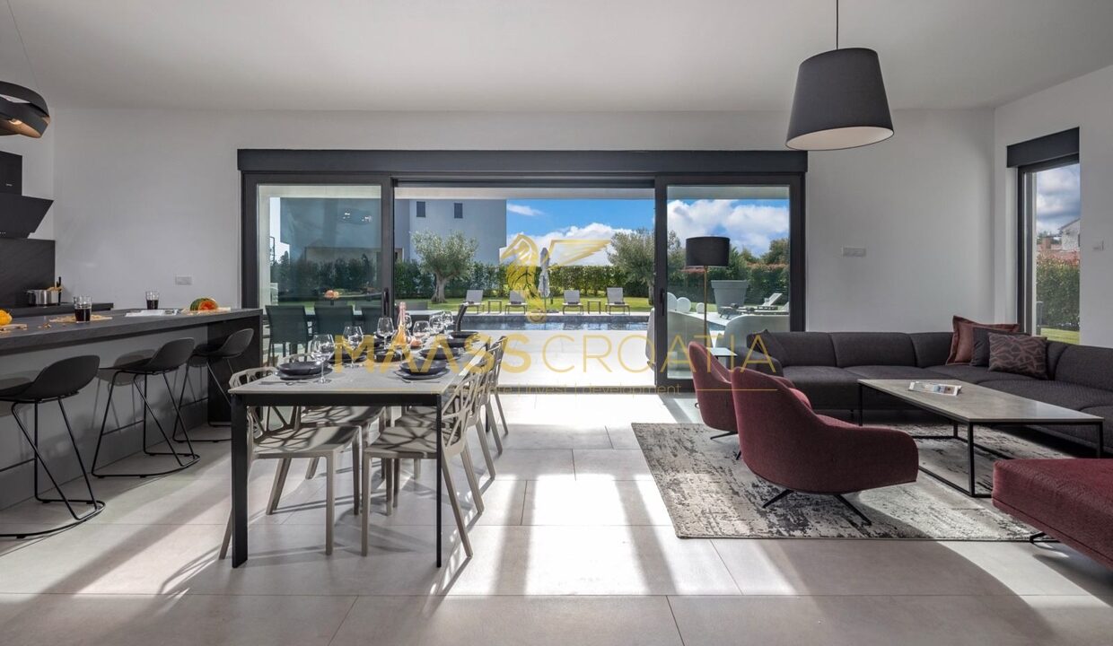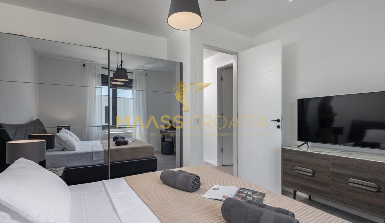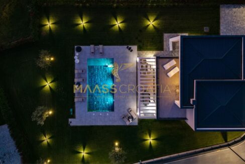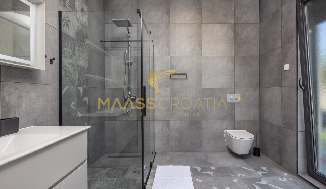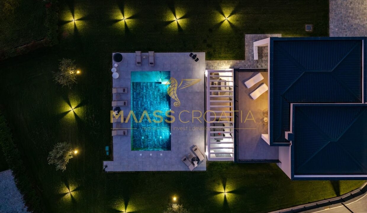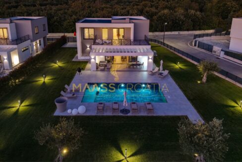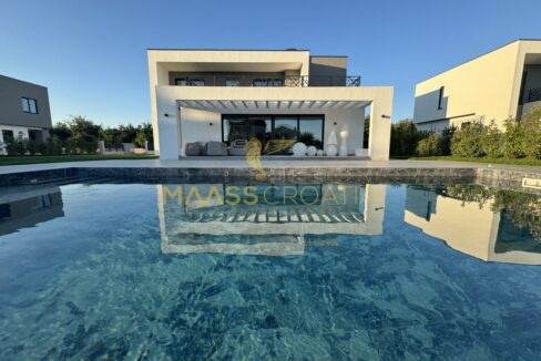 Nova luksuzna vile sa 4 spavaće sobe i 4 kupatila, prostranim dnevnim boravkom uz otvorenu i modernu kuhinju VENETA CUCINE, potpuno su opremljene novim namještajem ENZA HOME i bijelom tehnikom te najmodernijim tv uredjajima od 50-75’’. Bazenska tehnika uz automatsko doziranje i dizalicu topline te keramičke pločice ugradjene u bazen 10 x 5 metara. Vila se nalazi na parceli povrsine cca 1200m2. Dio je kompleksa od 10 vila koje će se iznajmljjivati za turističke svrhe uz očekivani godišnji prihod od 50.000€!