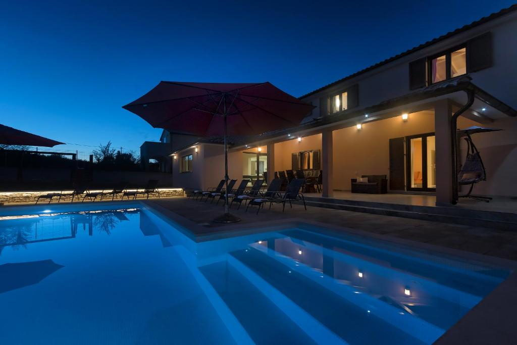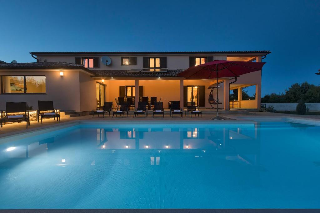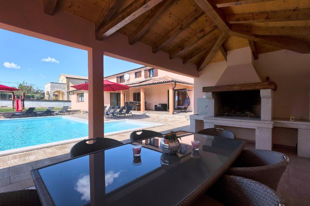 Interiøret er svært funksjonelt og komplementerer uterommet perfekt. Med en praktfull terrasse, et åpent kjøkken og dette fantastiske store svømmebassenget, kan du være vertskap for en rekke sammenkomster og uforglemmelige aktiviteter mens du nyter privatlivet i området og den unike beliggenheten.