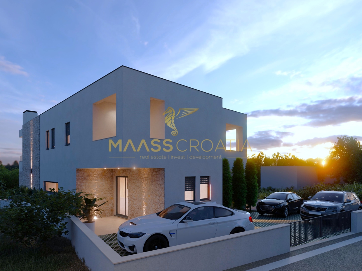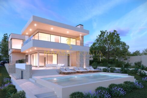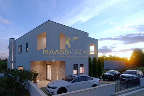 Vila, smještena na parceli od 600 m2, projektirana je modernom arhitekturom, čistim linijama, prostranim terasama i pomno odabranim materijalima.