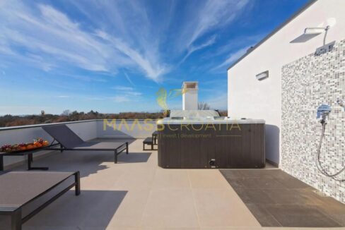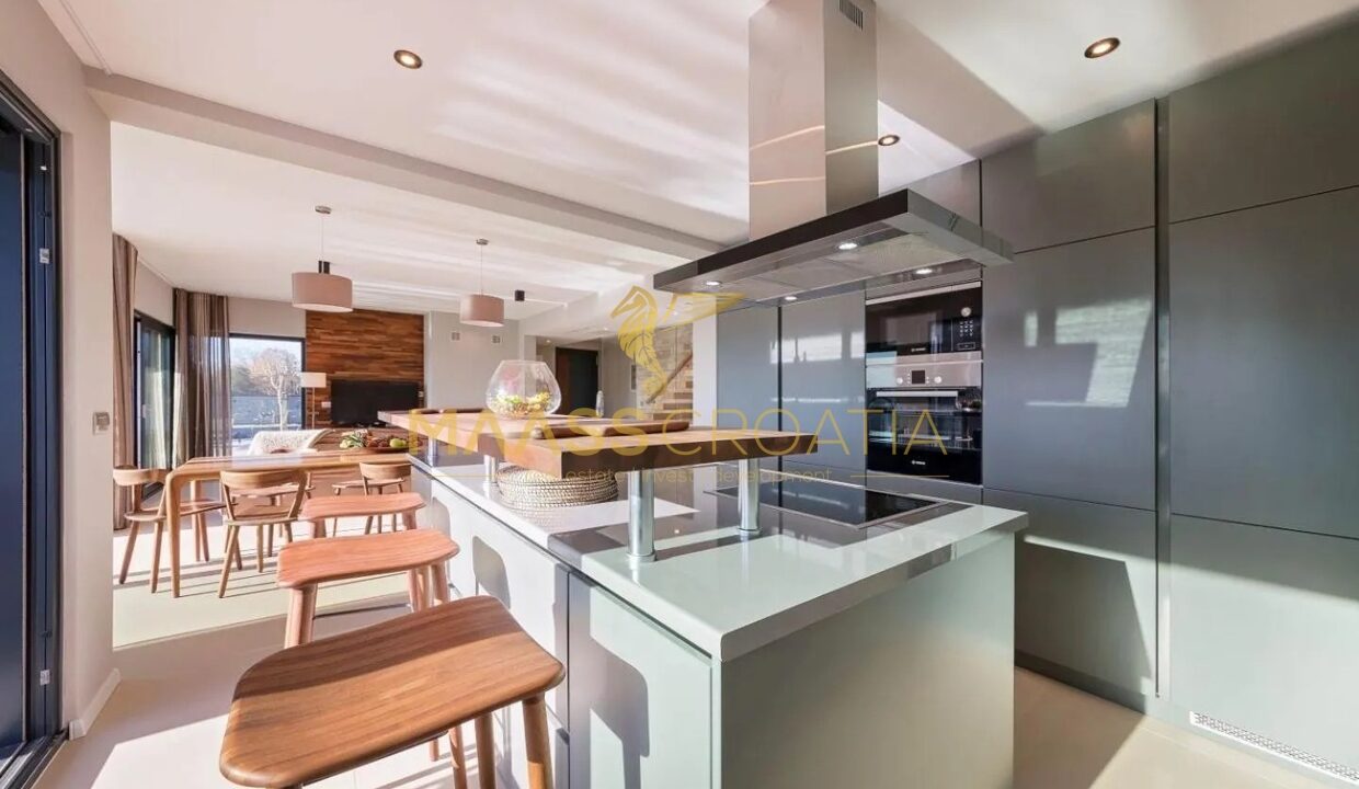 Vila se prostire na 117 m² stambene površine i sastoji se od tri prostrane spavaće sobe, od kojih svaka ima vlastitu kupaonicu, što jamči maksimalnu udobnost i privatnost za sve goste. U prizemlju se nalazi open space dnevni boravak povezan s blagovaonicom i moderno opremljenom kuhinjom, idealan za zajedničko druženje, kao i poseban toalet.