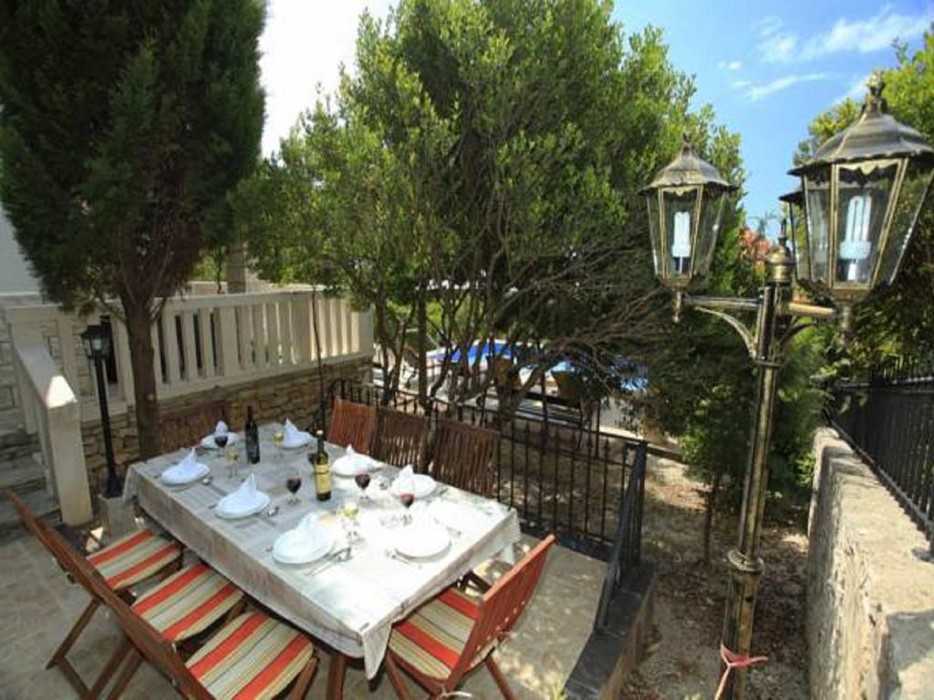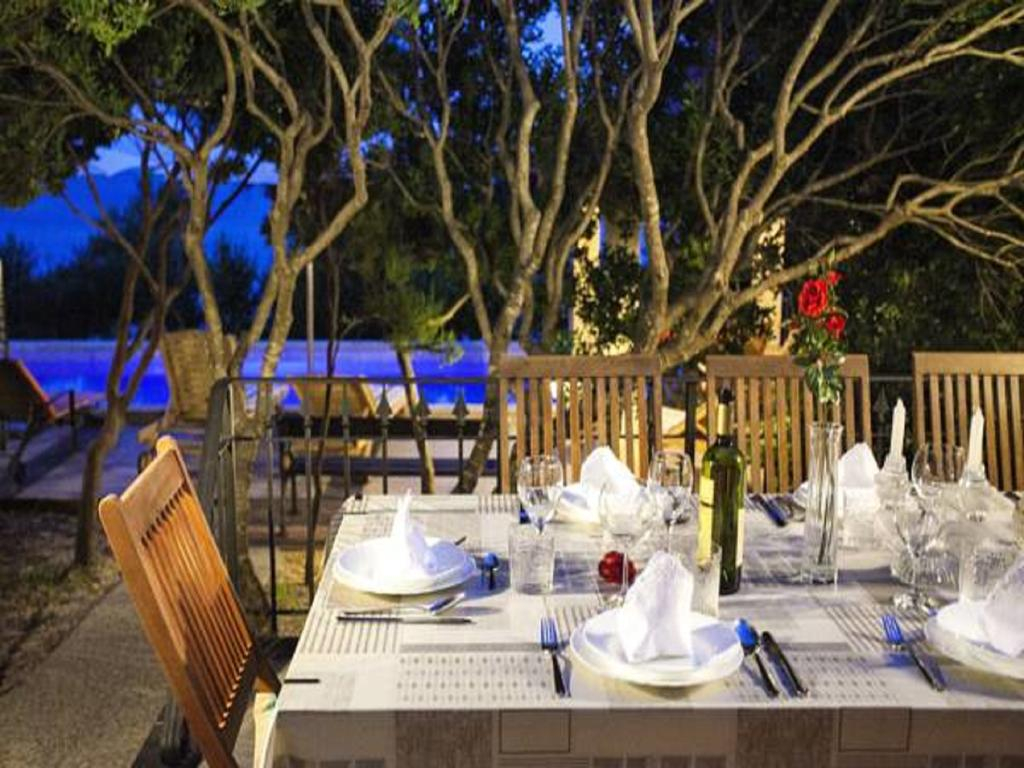 Vanjska terasa ima veliki bazen, nakon čega slijedi prostrani prostor za blagovaonicu i sjedenje, idealan za okupljanja i zabavu. Vila se također može pohvaliti šarenim malim vrtom koji oživljava cijeli posjed.