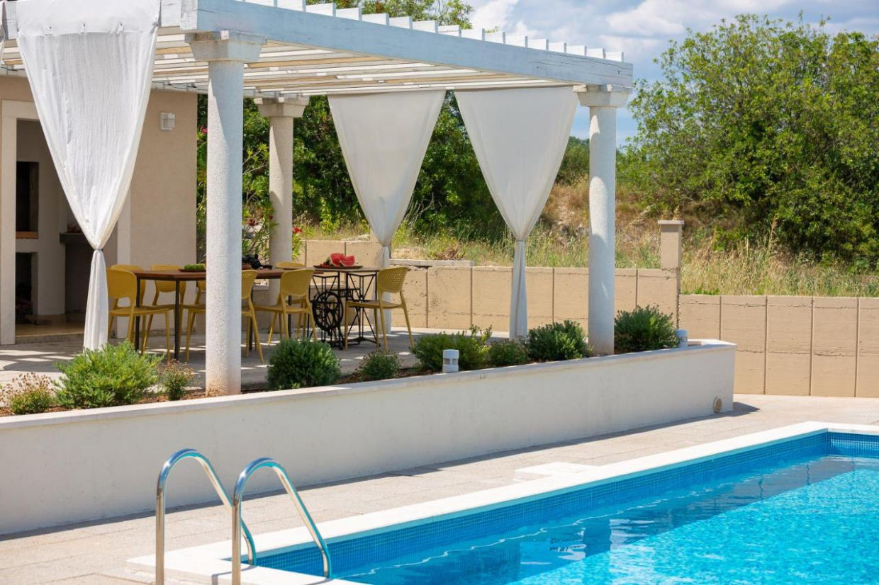 … Spomenuta prekrasna terasa, poduprta s četiri stupa i natkrivena, ugodno je mjesto za opuštanje i nudi izvrstan pristup vanjskoj kuhinji i bazenu.
