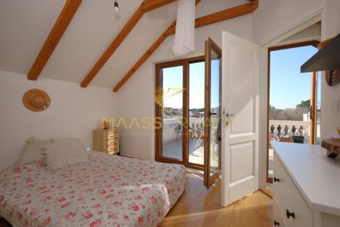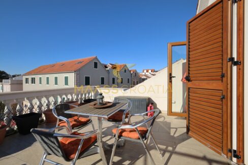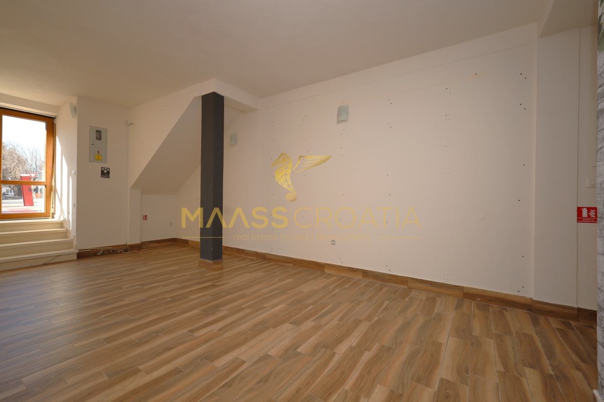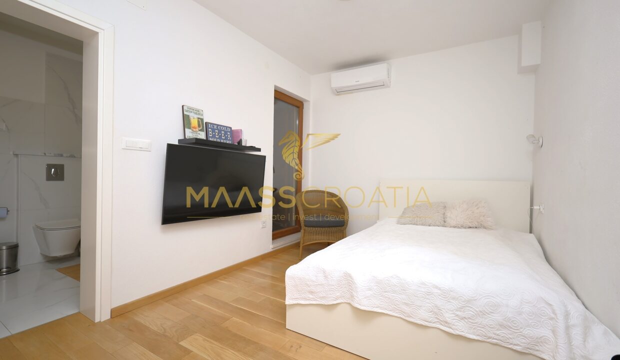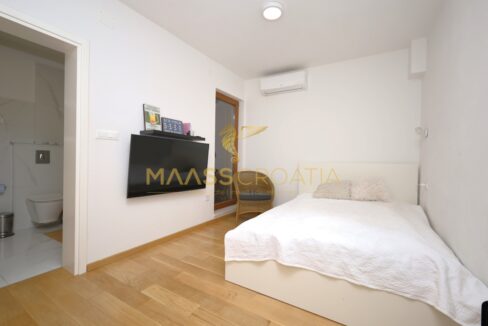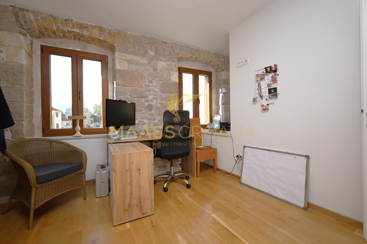 U prizemlju se nalazi poslovni prostor od 46,6 m², dok se trosobni stan od 123,5 m² prostire na 1. kat, 2. kat i potkrovlje. Kuća ima dvije terase: na prvom katu nalazi se terasa od 3,00 m², a na potkrovlju prostrana terasa od 23,57 m² s pogledom na središte grada, park i more. Na 1. katu nalaze se hodnik i dvije spavaće sobe, svaka s vlastitom kupaonicom. Na 2. katu nalazi se kuhinja s blagovaonicom i dnevnim boravkom u jednoj cjelini, te dodatni WC. U potkrovlju je spavaća soba s kupaonicom i izlazom na prostranu terasu s lijepim pogledom.