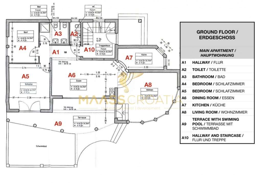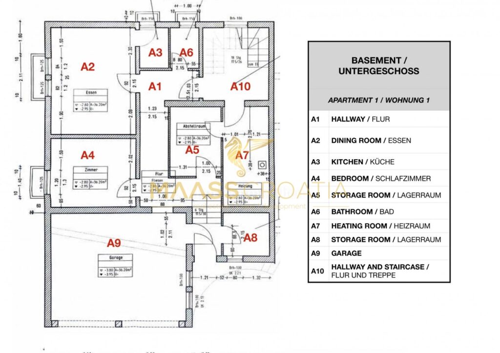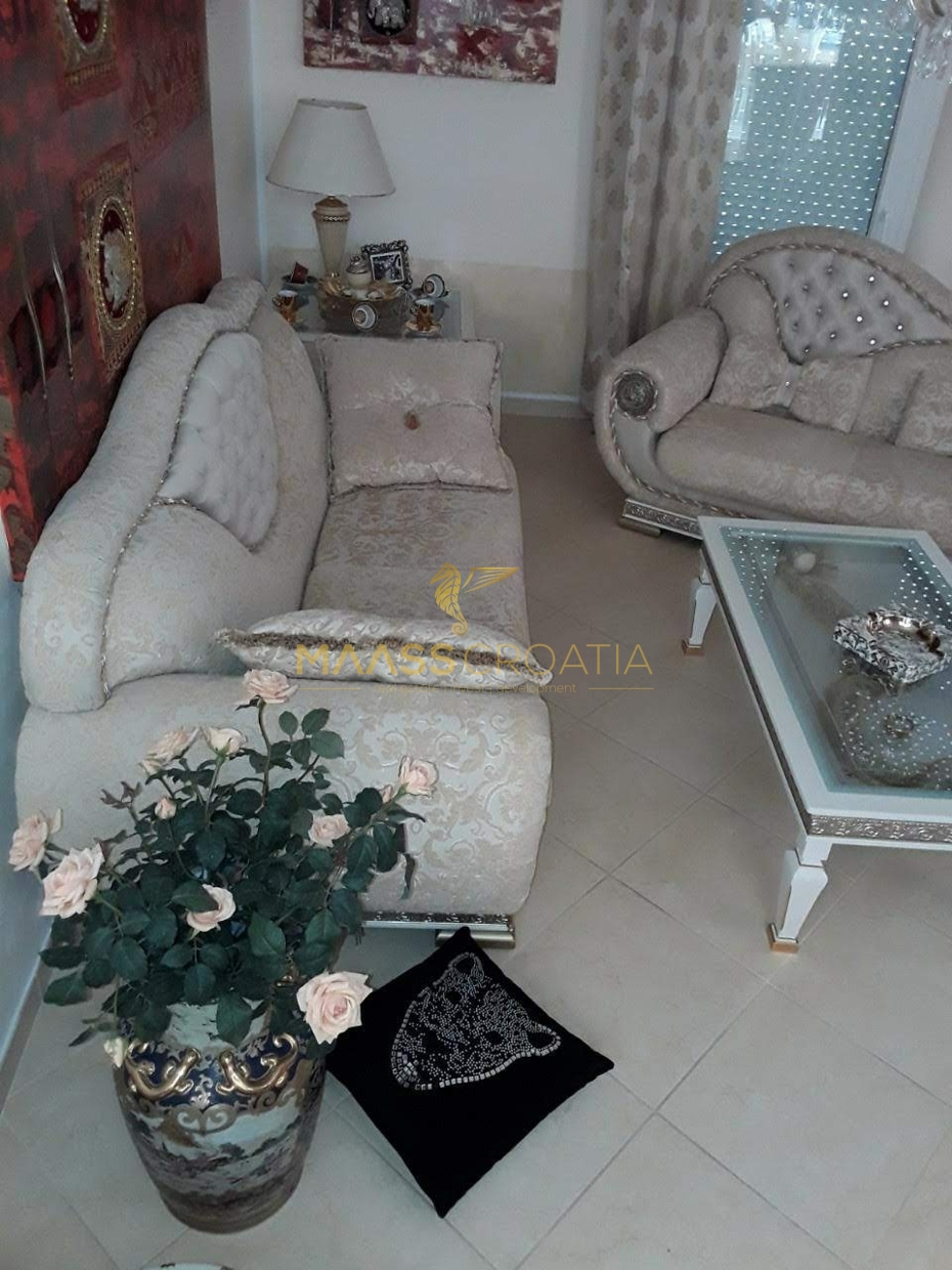 U suterenu kuće izgrađene 2004. godine nalazi se manji stan, u prizemlju se nalazi komforan stan koji se sastoji od dnevnog boravka, blagovaone sa kuhinjom, 2 spavaće sobe, 1 kupaonice i dodatnog wc-a te velike terase sa bazen.