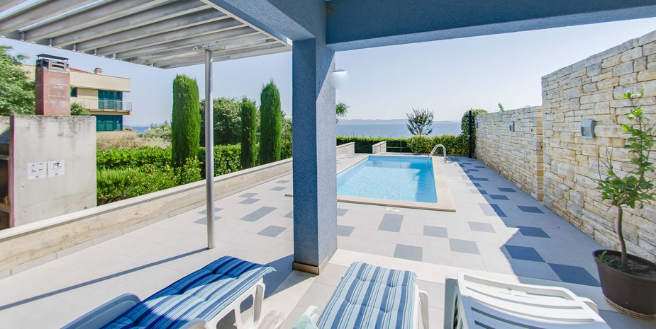 Ova fantastična vila s prekrasnim pogledom na more, uređena u upečatljivoj plavo-bijeloj boji, odmah će privući vašu pažnju.