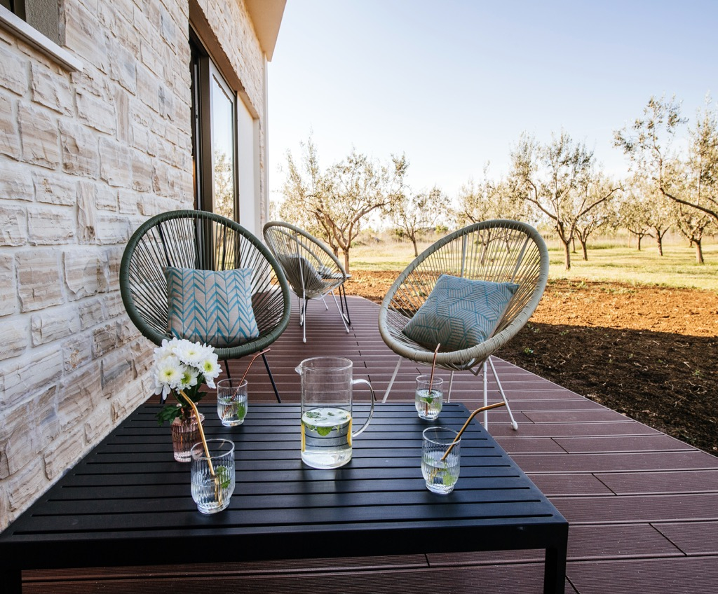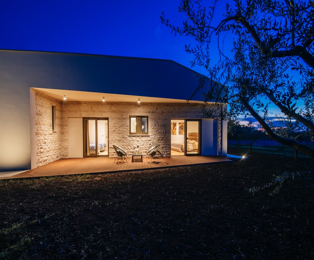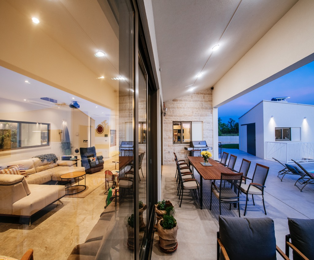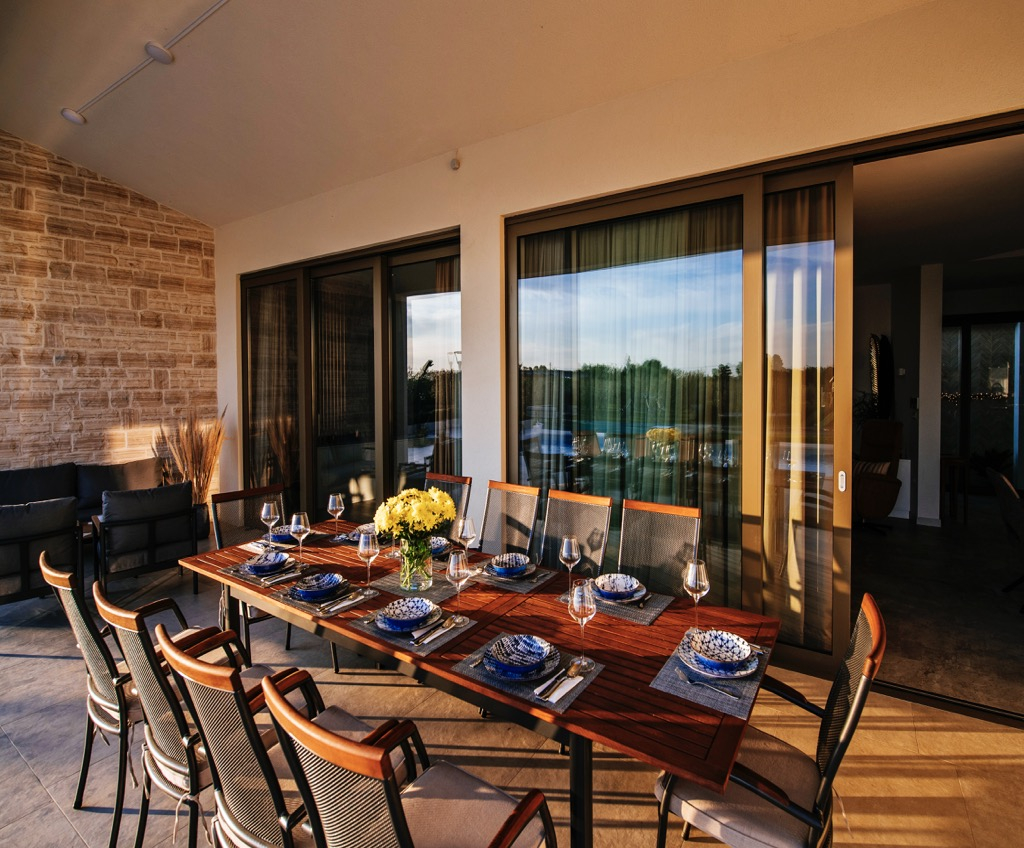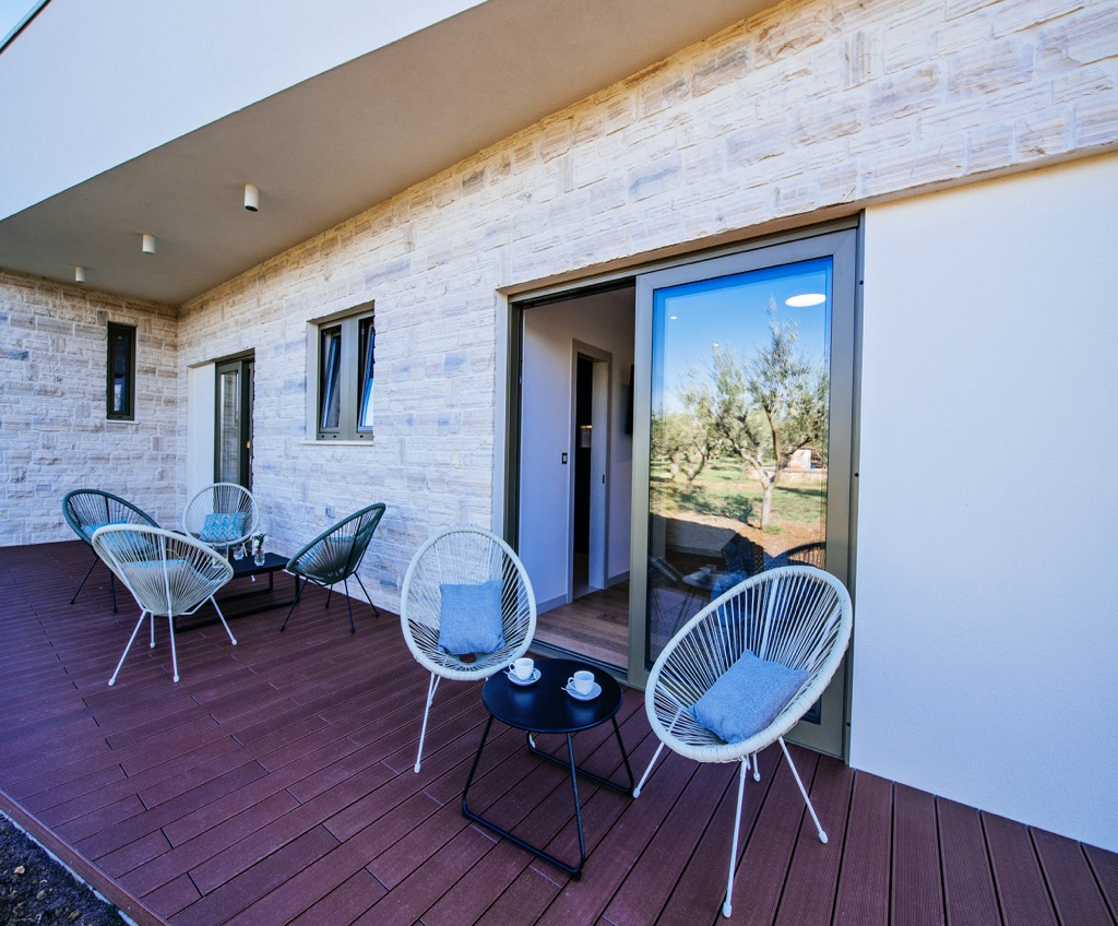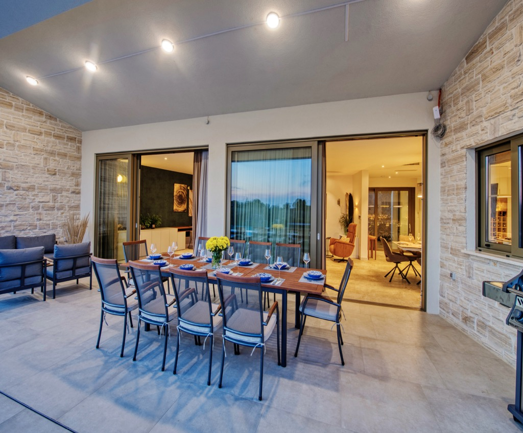 Prostrana terasa, koja služi kao dnevni boravak, povezana je s odvojenom kućom za goste i skladno se uklapa u cjelokupni dizajn.
