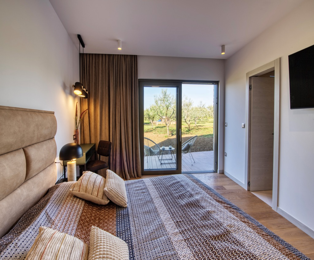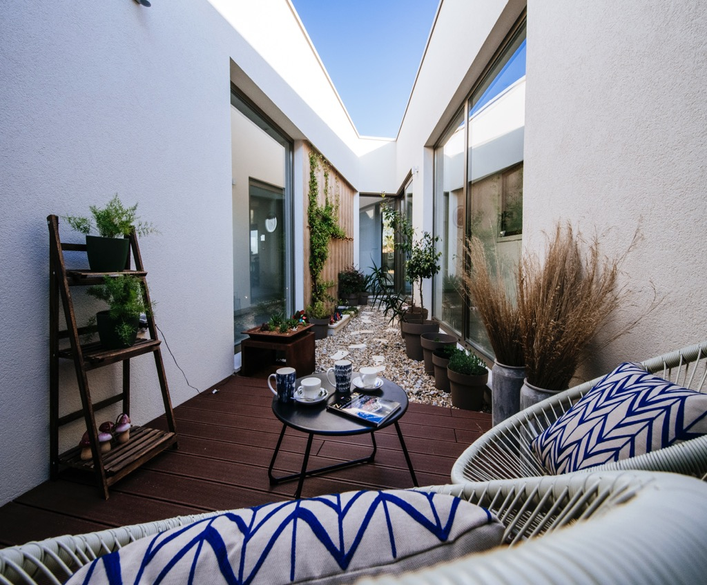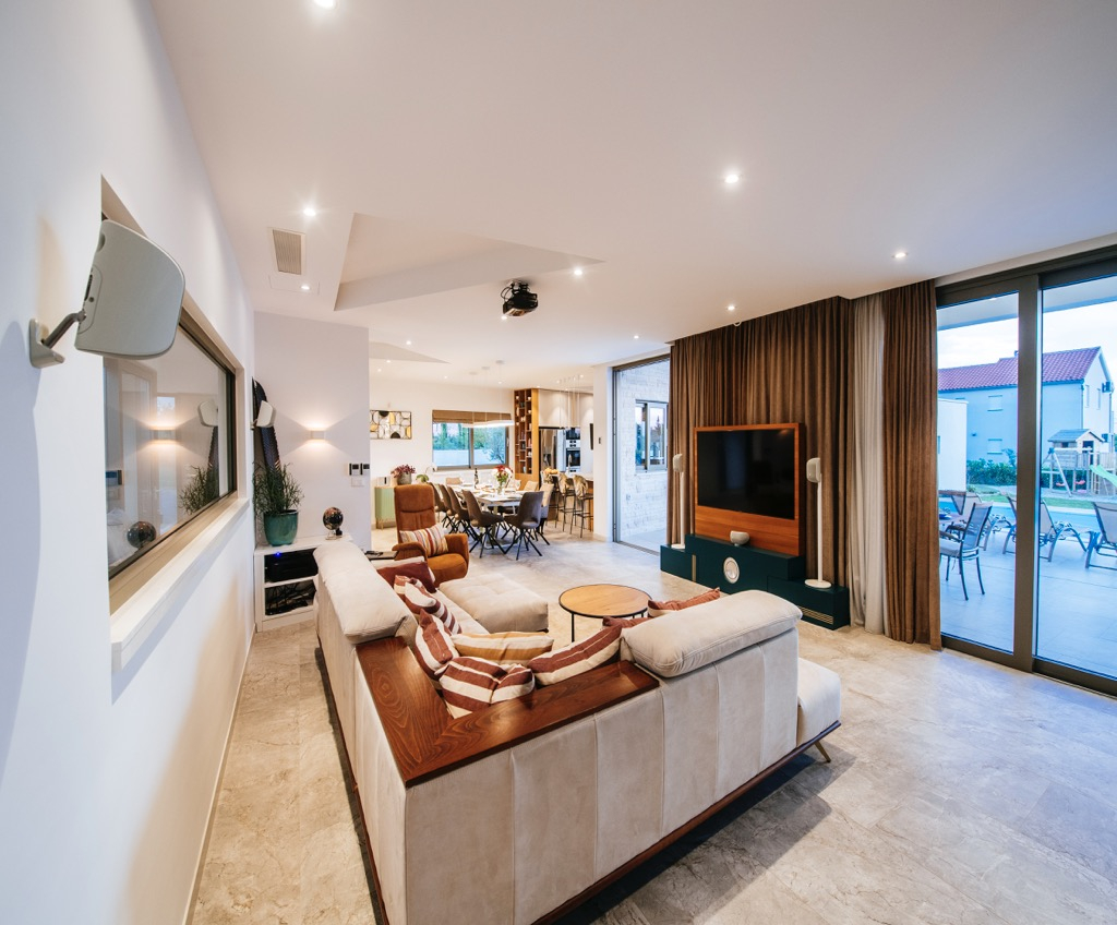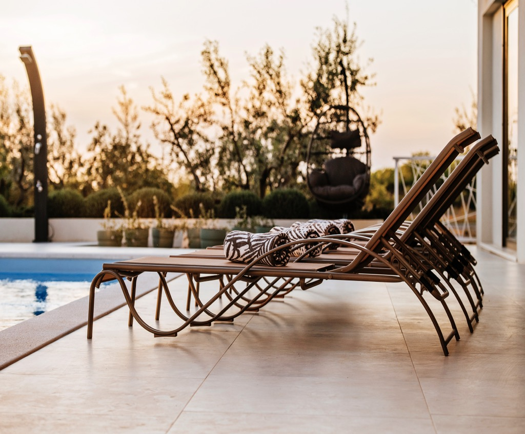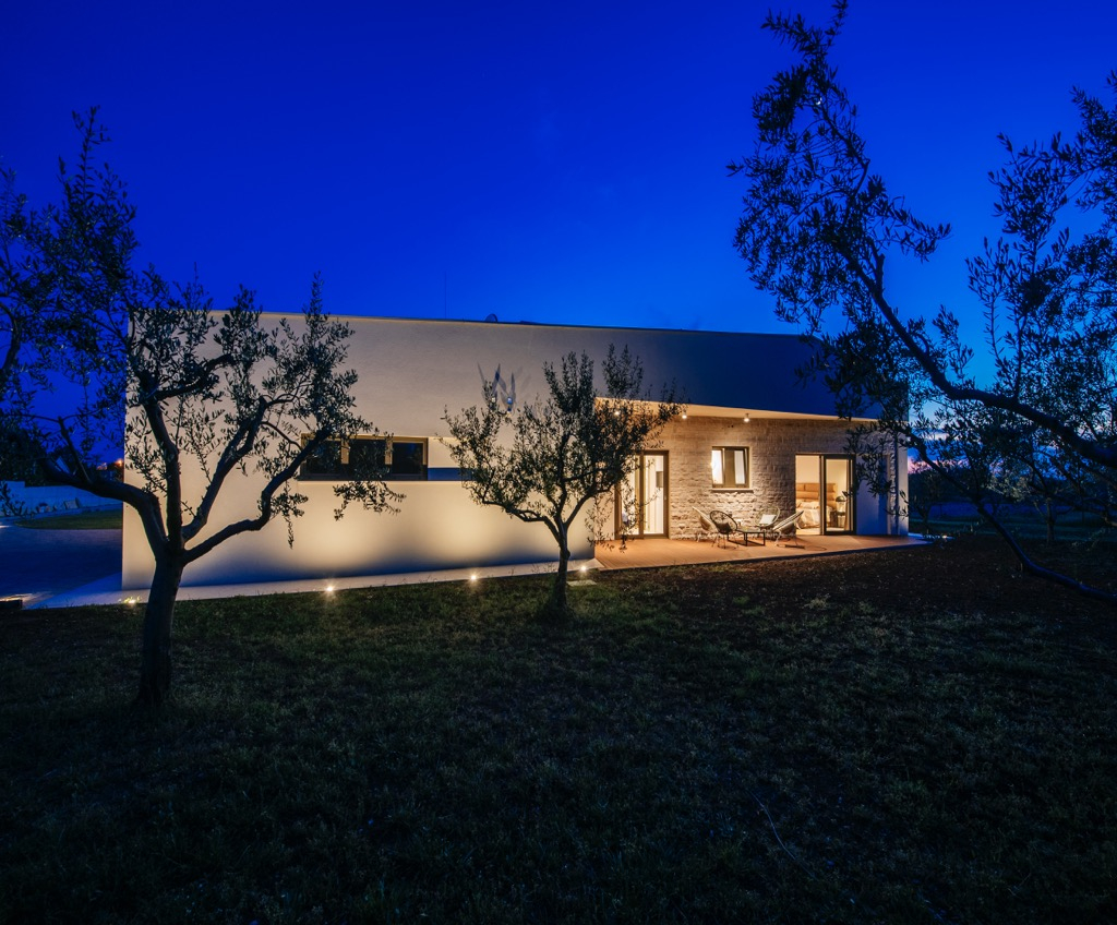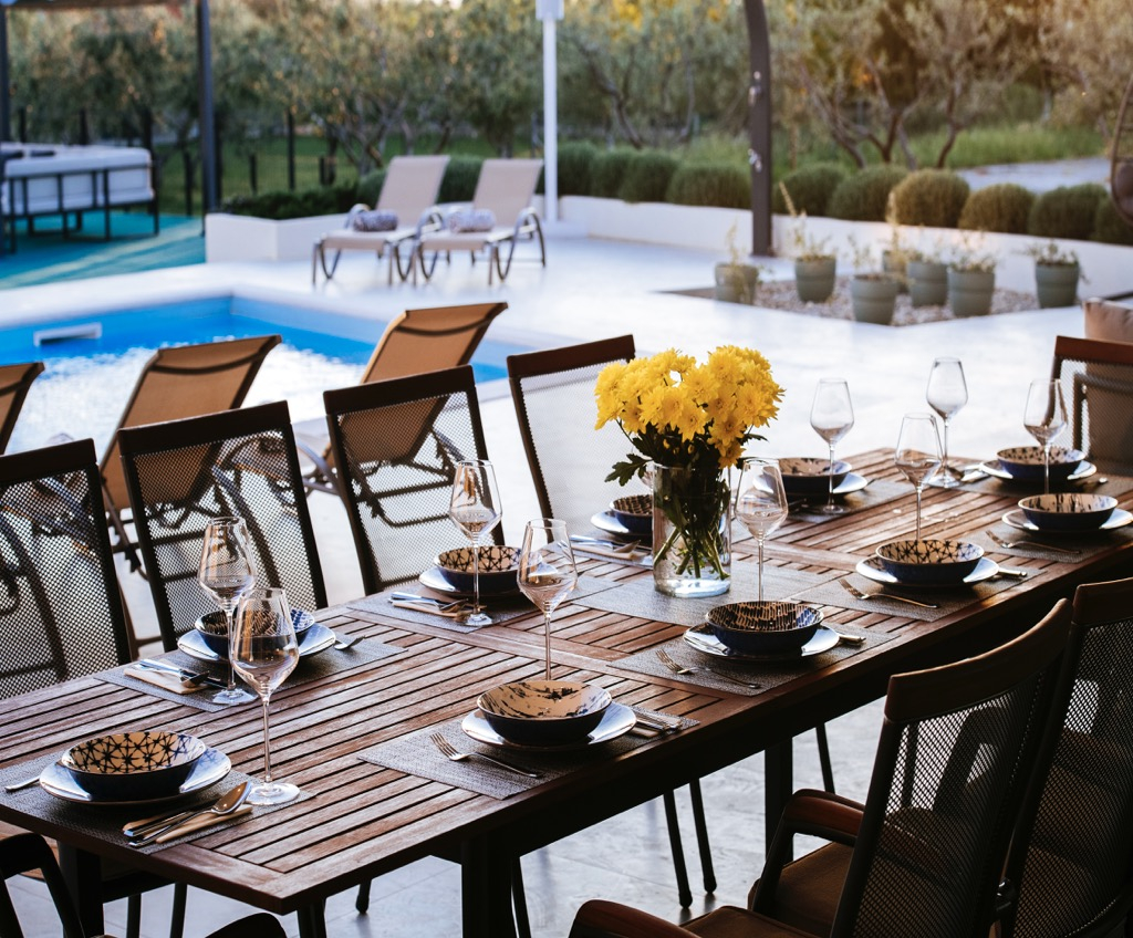 Prostrana terasa, koja služi kao dnevni boravak, povezana je s odvojenom kućom za goste i skladno se uklapa u cjelokupni dizajn.